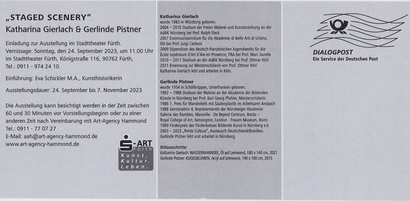 Insofern ist der Titel der Ausstellung „STAGED SCENERY“ mit Werken von Katharina Gierlach und Gerlinde Pistner ideal gewählt, zumal er den Ausstellungsort, das Stadttheater Fürth, mitverortet und zugleich auf die Basis aller Kunst verweist: sei es ein Theaterstück, Musik oder Malerei. Denn alle herausragende Kunst bildet stets eine Art „Bühne“, eine Projektionsfläche, bietet uns Betrachterinnen und Betrachter Assoziations- und Interpretationsräume. Im Idealfall machen wir komplexe sinnliche Erfahrungen, gewinnen neue Erkenntnisse, möglicherweise sogar eine neue Sicht auf unsere Wahrnehmung und die Welt. Mit der Titelgebung sowie der Auswahl der Künstlerinnen hat John Hammond ein besonderes Gespür erwiesen (Gratulation!).