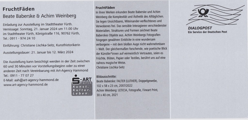 In ihren Werken erkunden Beate Baberske und Achim Weinberg die Komplexität und Ästhetik des Alltäglichen. Sie legen Unsichtbares, Miteinander-verflochtenes und Verwobenes frei. Das sensible Interagieren verschiedenster Materialien, Strukturen und Formen zeichnet Beate Baberskes Objekte aus. Achim Weinbergs Fotografien hingegen gewähren Einblicke in eine wundersam verborgene – mit dem bloßen Auge nicht wahrnehmbare – Welt. Der gleichermaßen forschende, wie poetische Blick der Künstler*innen auf vermeintlich Vertrautes, seien es Früchte, Blüten, Papier oder Textiles, berührt uns auf eine nahezu magische Weise.