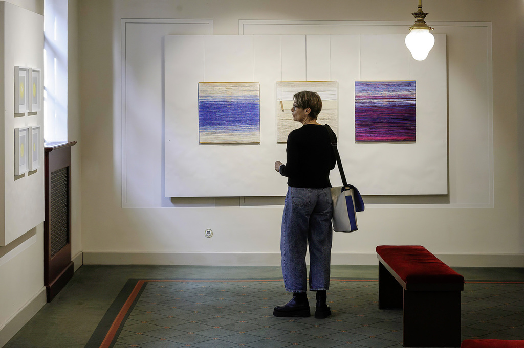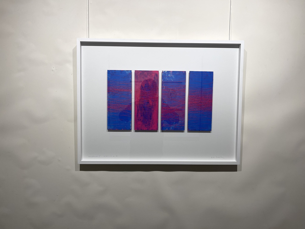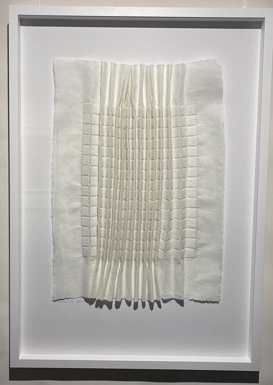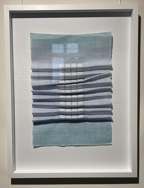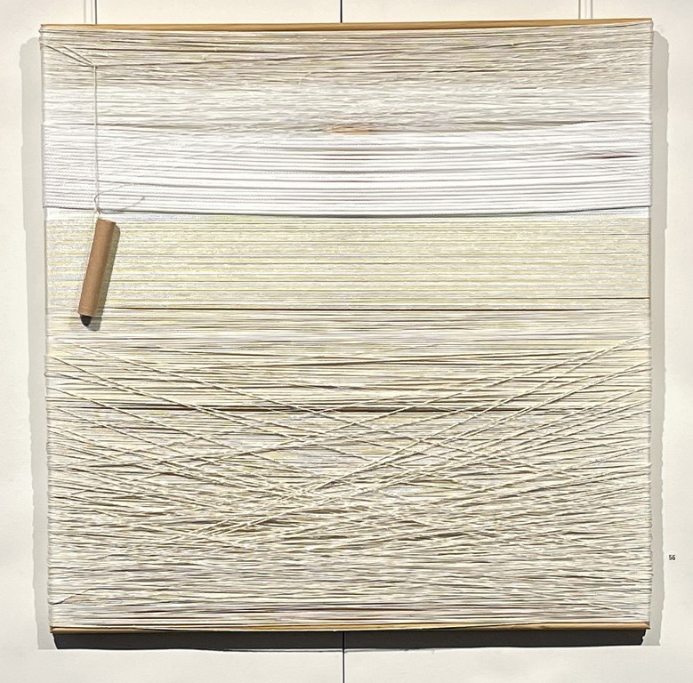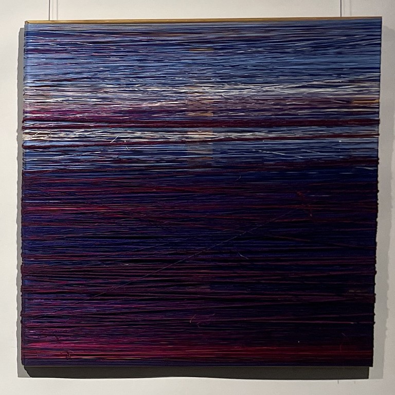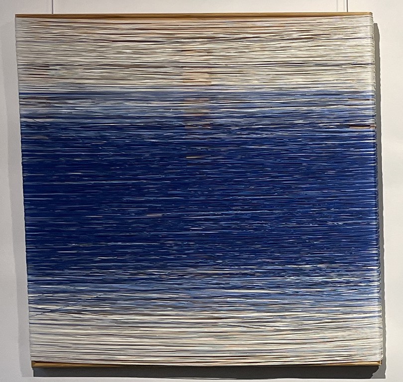 Dass dem so ist, lässt sich etwa bei ihrer Arbeit mit dem nicht ganz handlichen Titel „Deepbluethreadonlightbluethreadonwhitethread“ untersuchen. Nicht nur das quadratische Format, sondern auch die Farbgebung strahlen auf Anhieb ein Gefühl von Ruhe aus.