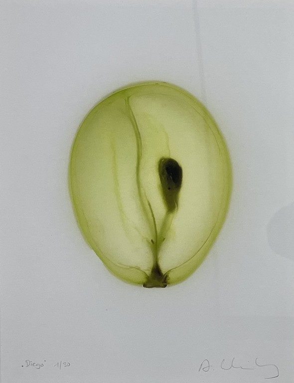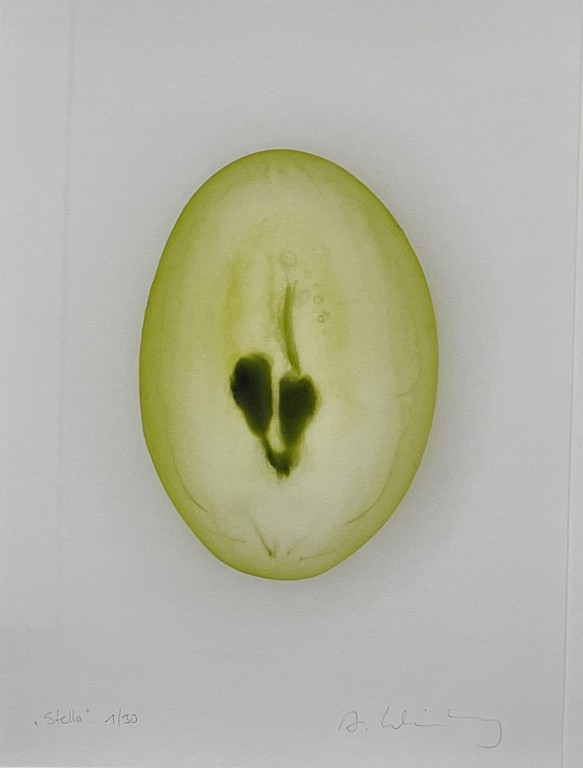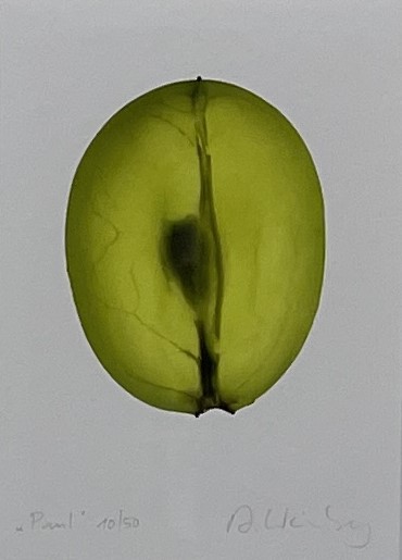 Achim Weinbergs Fotografien ziehen zunächst einmal an, weil sie von einer durchscheinenden feinen Schönheit sind. Plötzlich wird klar, dass es alltägliche Dinge sind, die hier in den Fokus gerückt wurden. Tafeltrauben, zum Beispiel. Als hauchdünner Querschnitt durch die Frucht gewinnen die Objekte in extremer Vergrößerung Individualität. Statt als Supermarktkauf auf dem Küchentisch zu landen, lässt Weinberg sie zu Persönlichkeiten reifen.