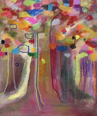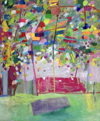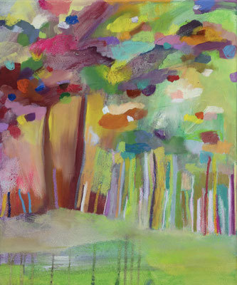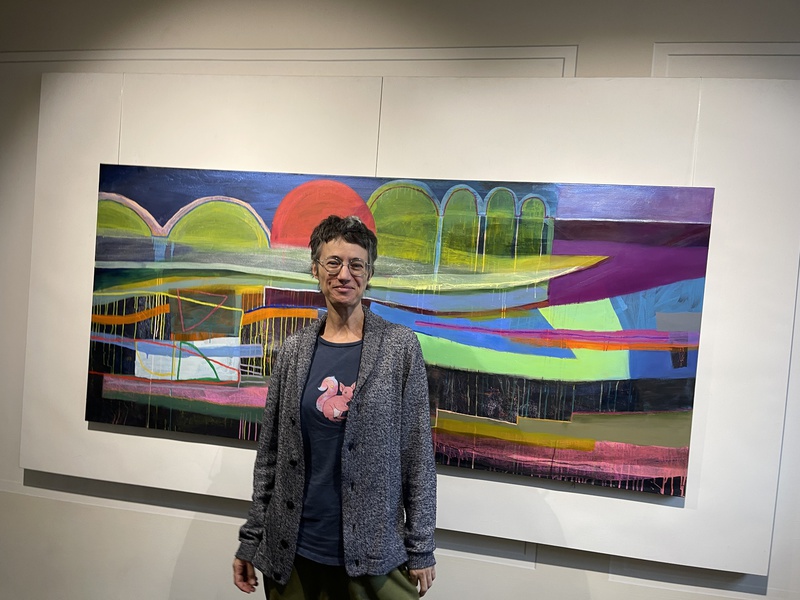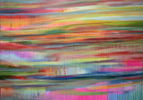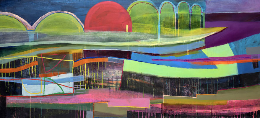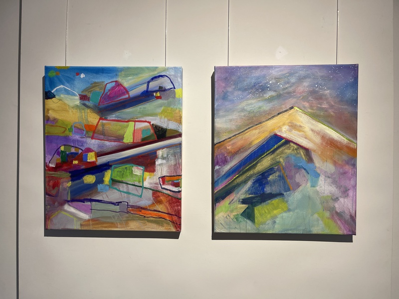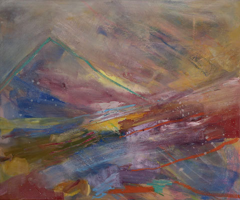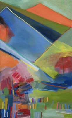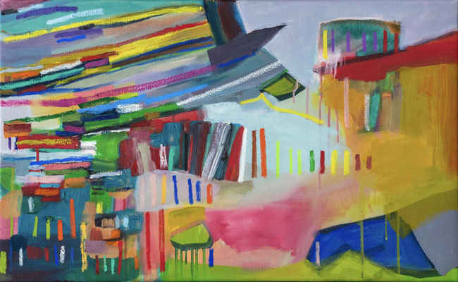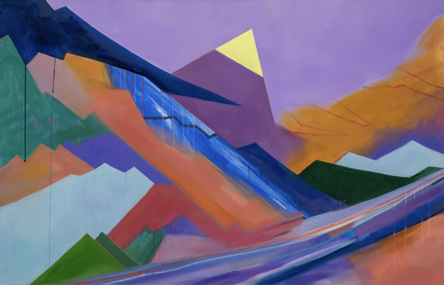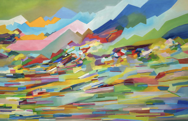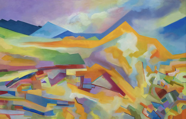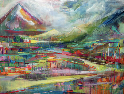Diese Erlebnisse hat die 44-jährige, die 2008 den Kulturförderpreis der Stadt Fürth erhielt und zum Orga-Team der Frei Luft Galerie gehört, in Mixed-Media-Werken auf Leinwand festgehalten. Herausgekommen sind heute Portraits innerer und äußerer Reisen. Die Landschaften wirken stilisiert, teils geometrisch, teils stehen farbliche Eindrücke getupft und flirrend im Vordergrund. Ein Haken oder Dreieck markiert einen Berg, ein Klecks steht für ein Haus oder einen Baum.