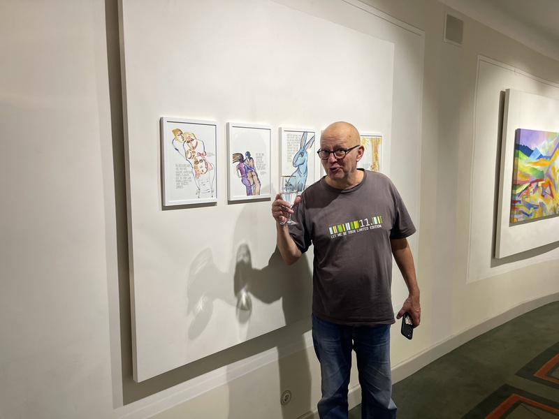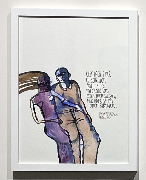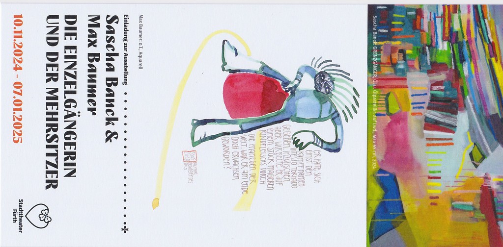 Humorvoll packt Max Baumer, ebenfalls aus Fürth, die Dinge in comicartigem Stil an. Als „Jazz-Improvisation für die Augen“ bezeichnet er selbst seine Arbeiten. Der Spruch trifft das Spielerische, Lockere, aus der Situation heraus Entstandene gut. Da liest man neben einem stilisierten Paar, dass sie sich erst nach eingehender Prüfung des Hüftknochens für oder gegen den Partner entschieden habe.