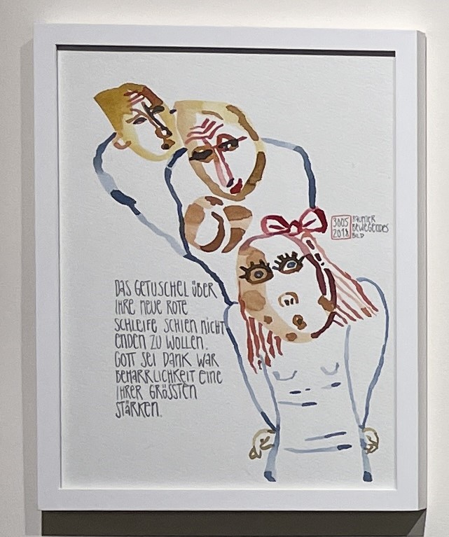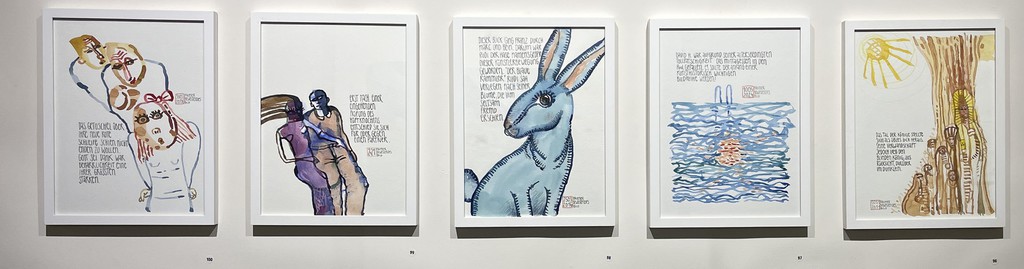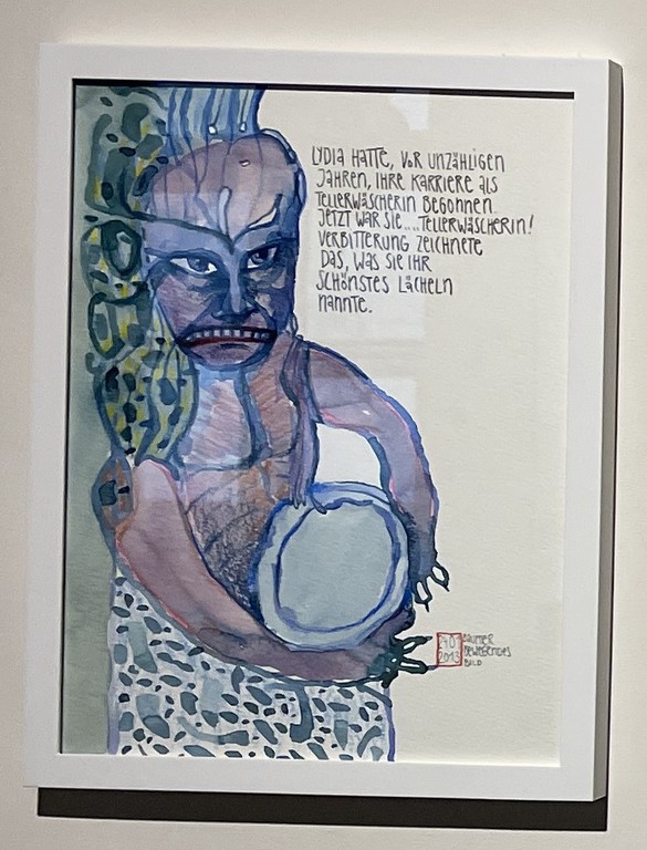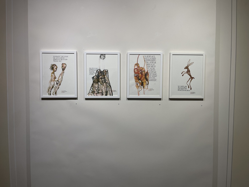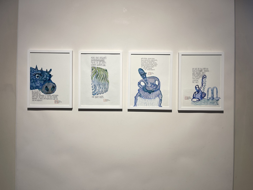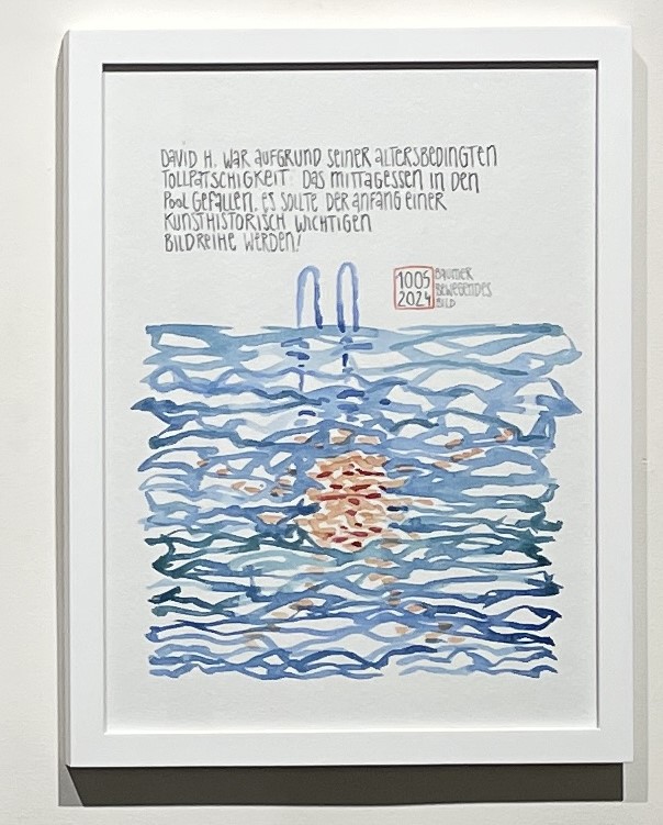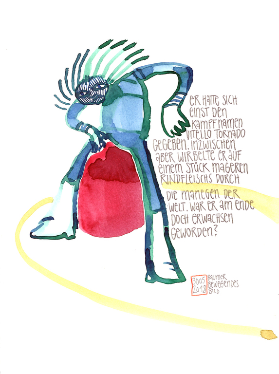 Das alles kann wie Mini-Parabeln an reale zwischenmenschliche Begebenheiten erinnern die hier ins Zeitlose übertragen und mit einem Augenzwinkern kommentiert werden. Jedermann fällt dann wohl etwas ein. Nur eben nicht mit Baumers scharfem Witz und seiner gekonnten Aquarell-Technik, die in Richtung Tusche weist. Spannen, wie Bild und Text absolut gleichwertig nebeneinanderstehen. Entsprechend betont Baumer auch, dass beides im Prozess zugleich entsteht und keiner den Vorrang hat. Er malt keine Dinge die ihm widerfahren sind, und illustriert auch keine Texte mit Bildern. Sondern überrascht sich am liebsten selbst. So geht es auch dem Publikum im