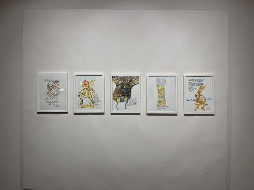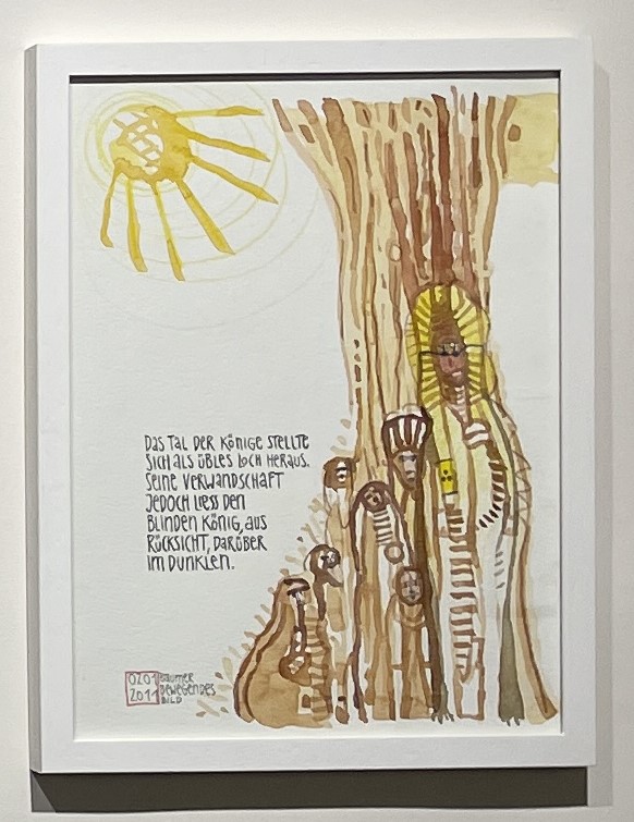 Auf einem anderen Tableau mit Sonne und stilisierten Ägyptern heißt es, dass das Tal der Könige ein übles Loch sei, aber die Verwandten hätten den blinden König aus Rücksicht darüber in Dunkeln gelassen. Es geht um Karriere, Schönheit und Erfolg, die doch oft nur Schein sind, um allzu Menschliches wie Angeberei, Eitelkeit oder Frust.