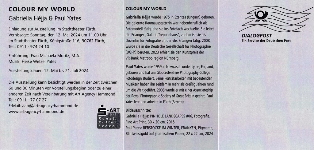 FÜRTH - Ihre Gemeinsamkeiten sind klar: Gabriella Héjja und Paul Yates sind beide Fotografen, die mit der Kamera förmlich malen. Ihre Doppel-Ausstellung im Stadttheater-Foyer trägt zwar den Titel „Colour my World“, sie könnte aber auch gut „Licht-Zeichen“ heißen, denn genau solche senden die Arbeiten aus. Die Künstler rücken gleichermaßen das Spiel mit dem Licht in den Mittelpunkt.