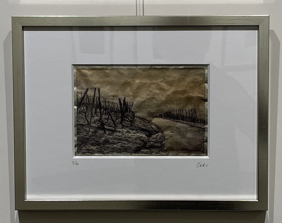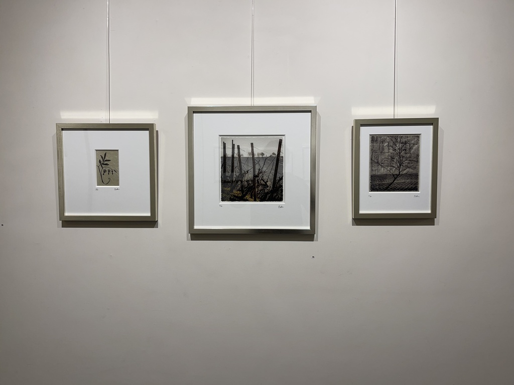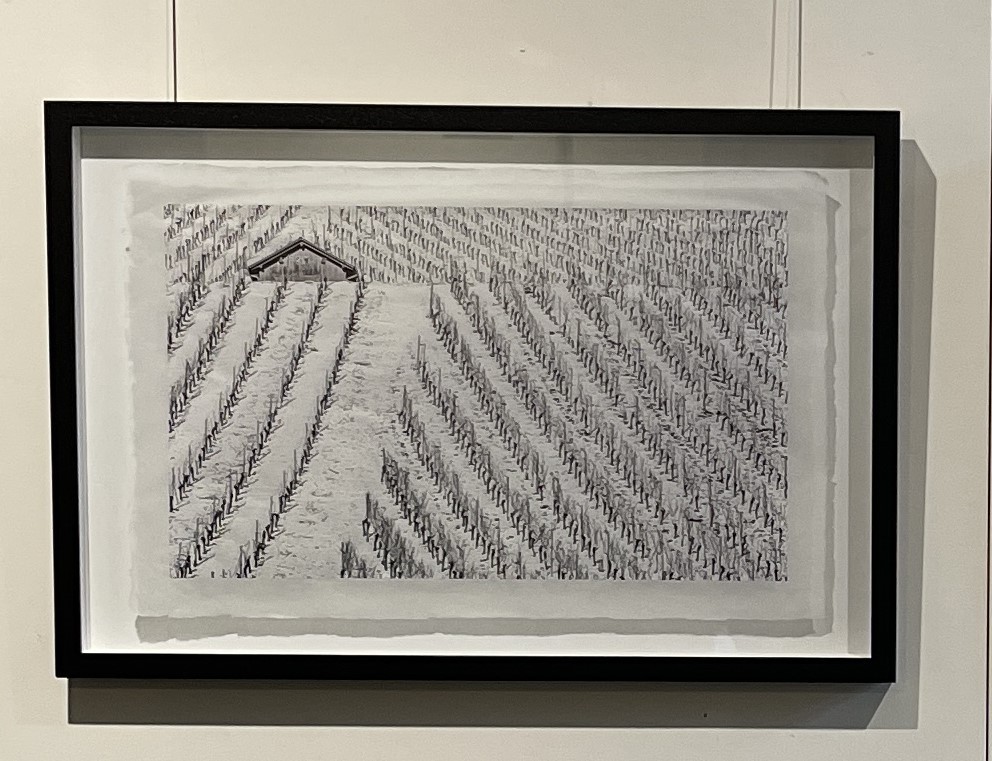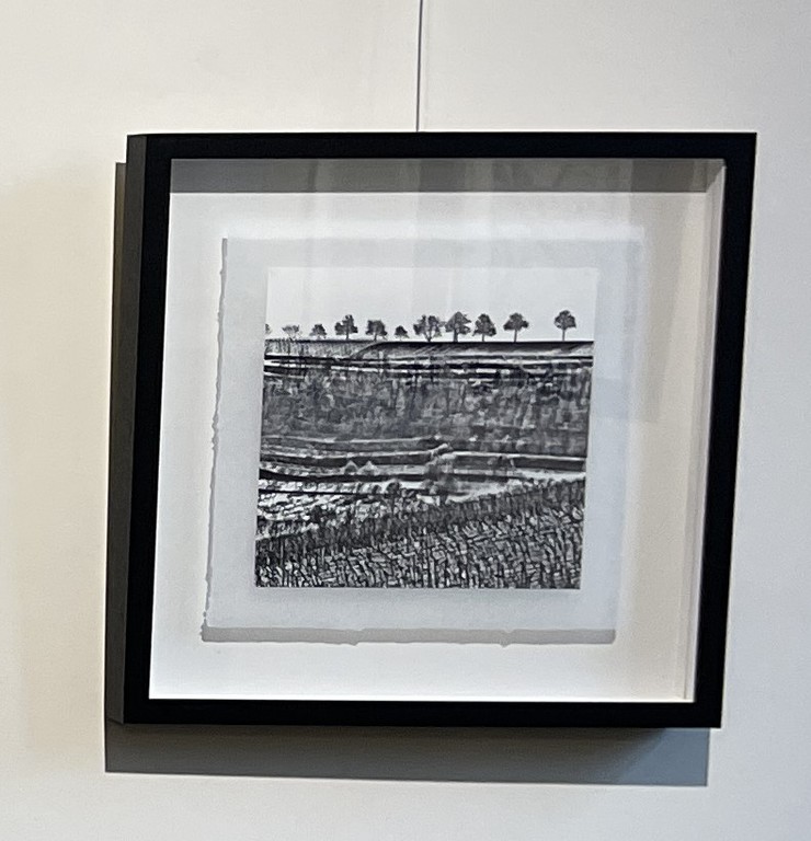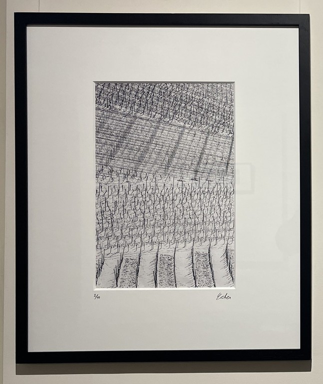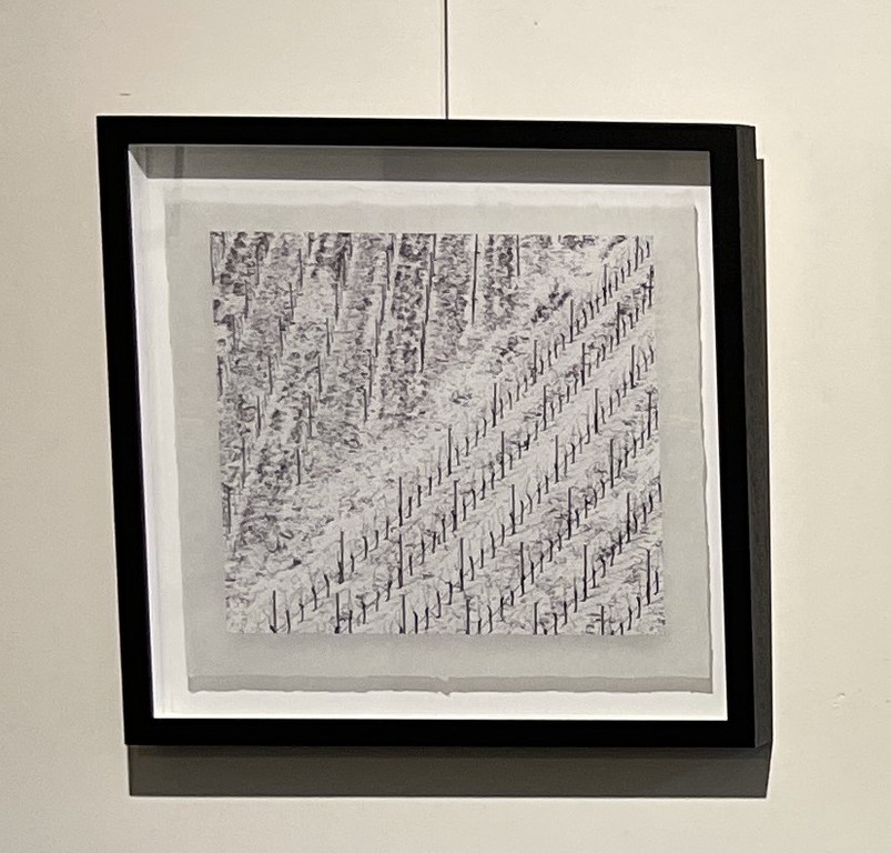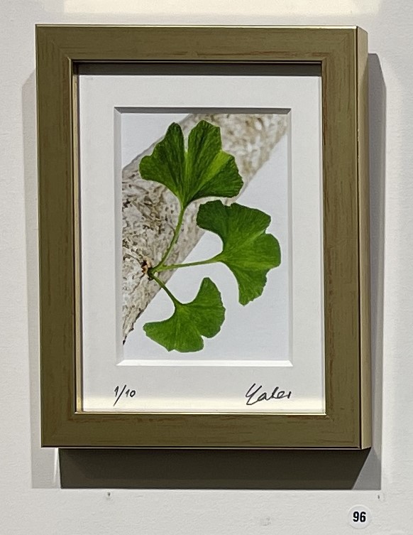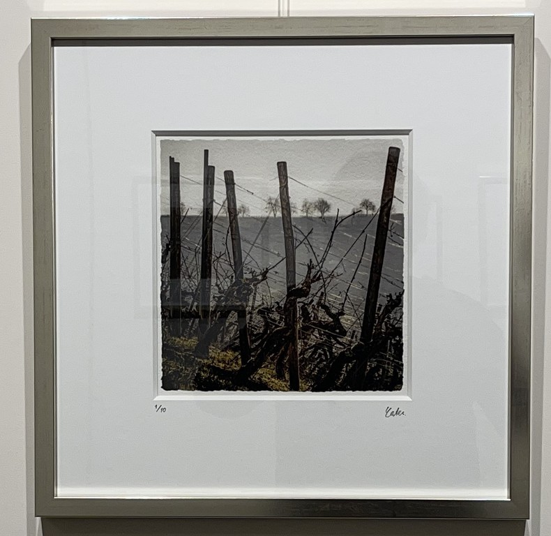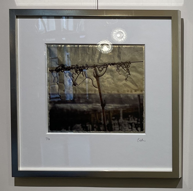 Dabei hat er sich für Abaca-Papier entschieden, das dünn, aber zugleich reißfest ist und in Handarbeit angefertigt wurde. Die Farbigkeit im Naturspektrum Grün, Braun, Grau wird äußerst dezent und bewusst eingesetzt, etwas ganz Besonders ist es, wenn bei einer Blüte mal Rot oder helles Weiß auftaucht, wenn Ginko-Blätter frisch grün glänzen. Das Tableau der Rebstöcke wirkt grafisch, wie eine Konstruktion, erstellt mit Bleistift. Immer wieder muss man sich ins Gedächtnis rufen, es hier mit Fotografien zu tun zu haben.