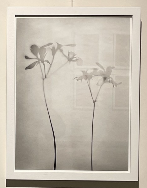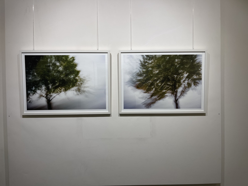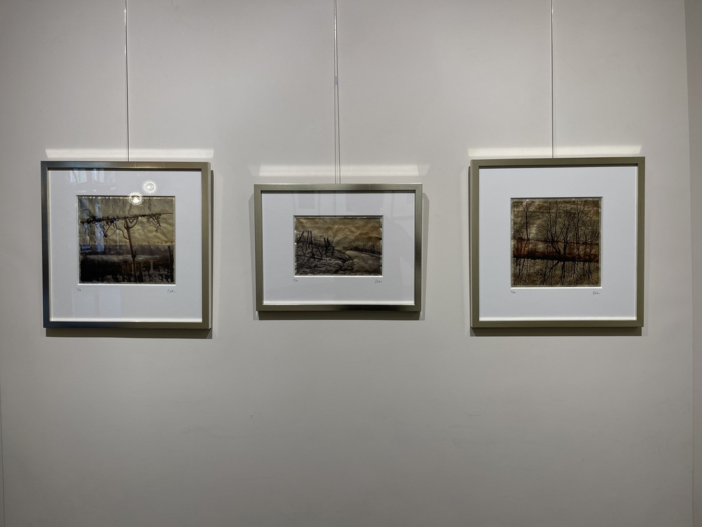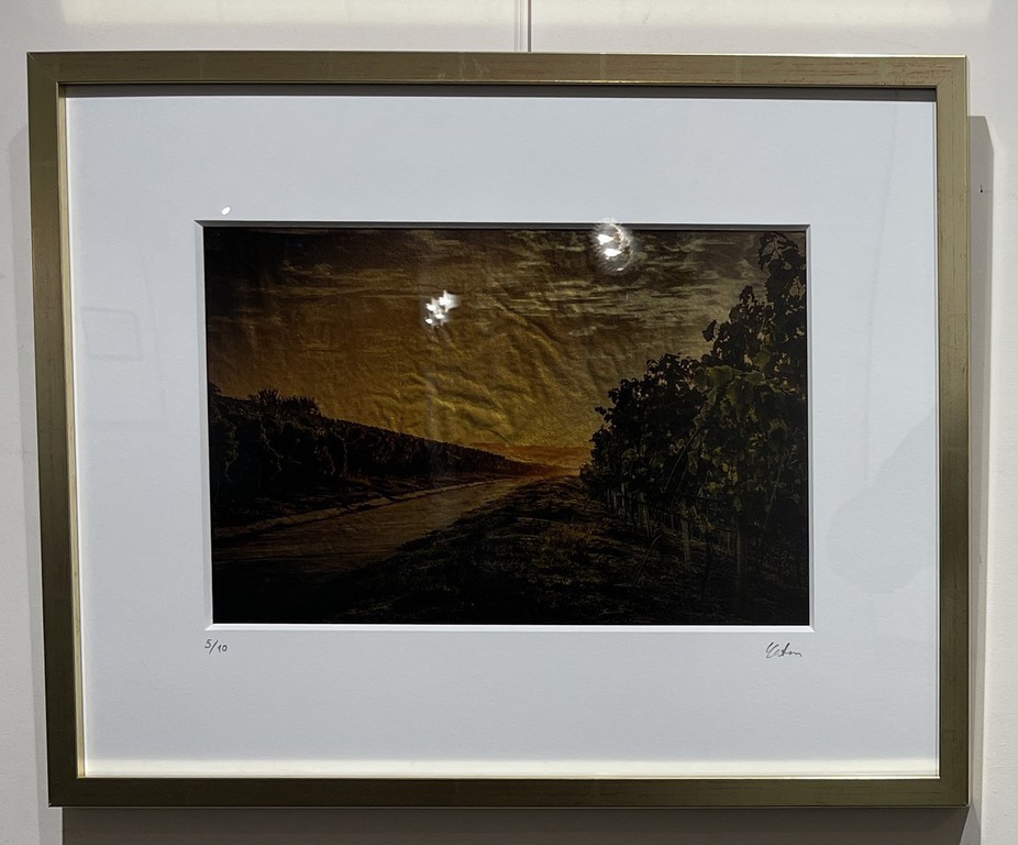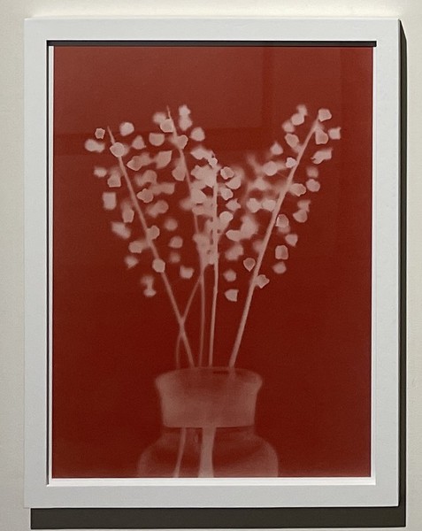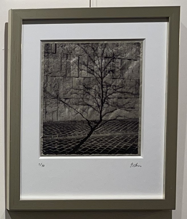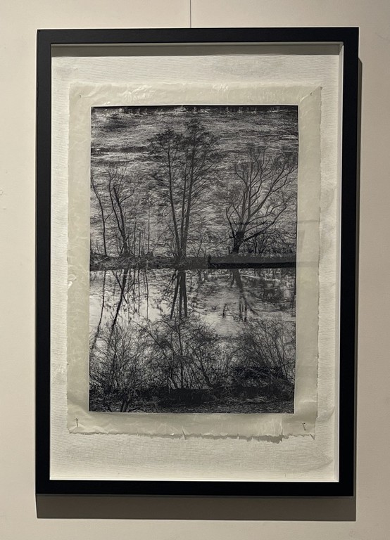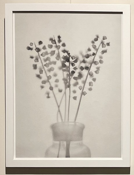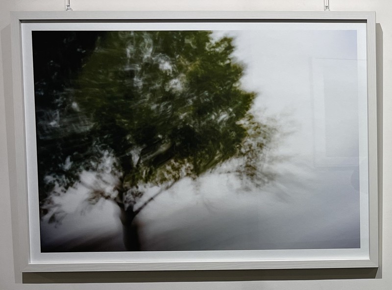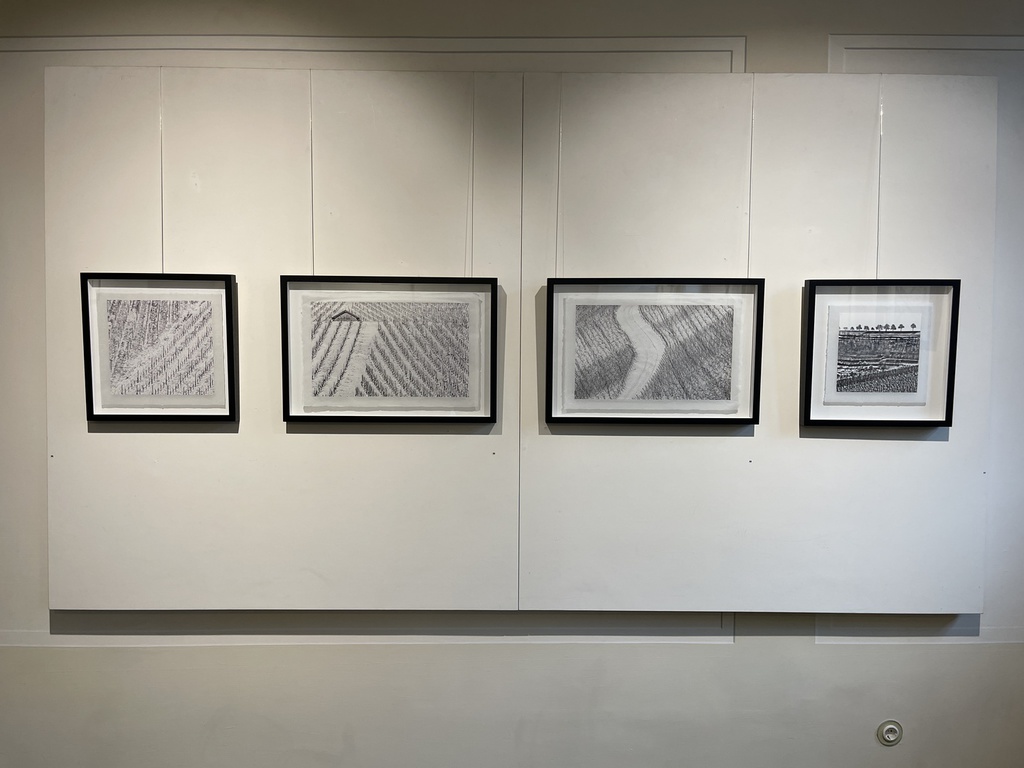 Dabei hat er sich für Abaca-Papier entschieden, das dünn, aber zugleich reißfest ist und in Handarbeit angefertigt wurde. Die Farbigkeit im Naturspektrum Grün, Braun, Grau wird äußerst dezent und bewusst eingesetzt, etwas ganz Besonders ist es, wenn bei einer Blüte mal Rot oder helles Weiß auftaucht, wenn Ginko-Blätter frisch grün glänzen. Das Tableau der Rebstöcke wirkt grafisch, wie eine Konstruktion, erstellt mit Bleistift. Immer wieder muss man sich ins Gedächtnis rufen, es hier mit Fotografien zu tun zu haben.