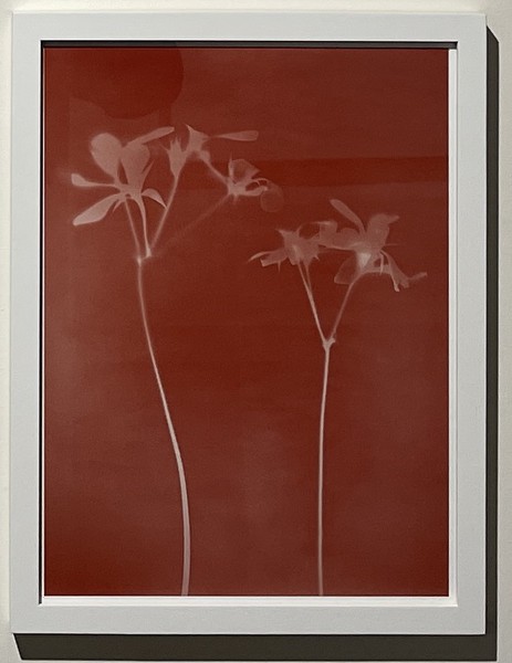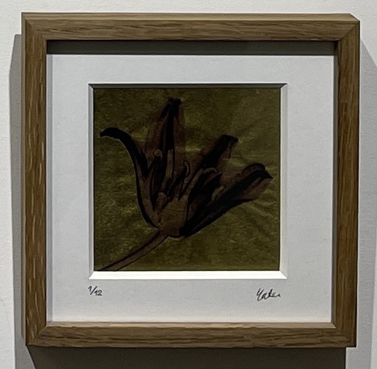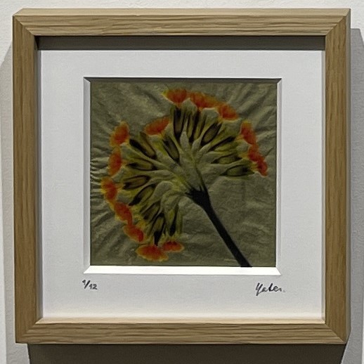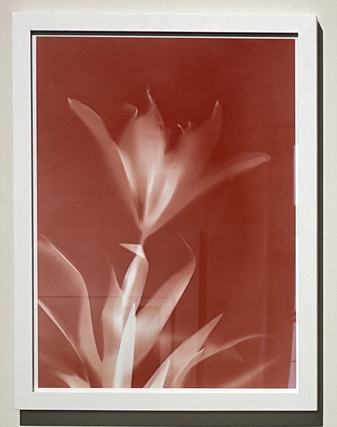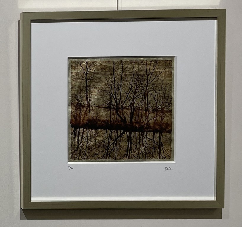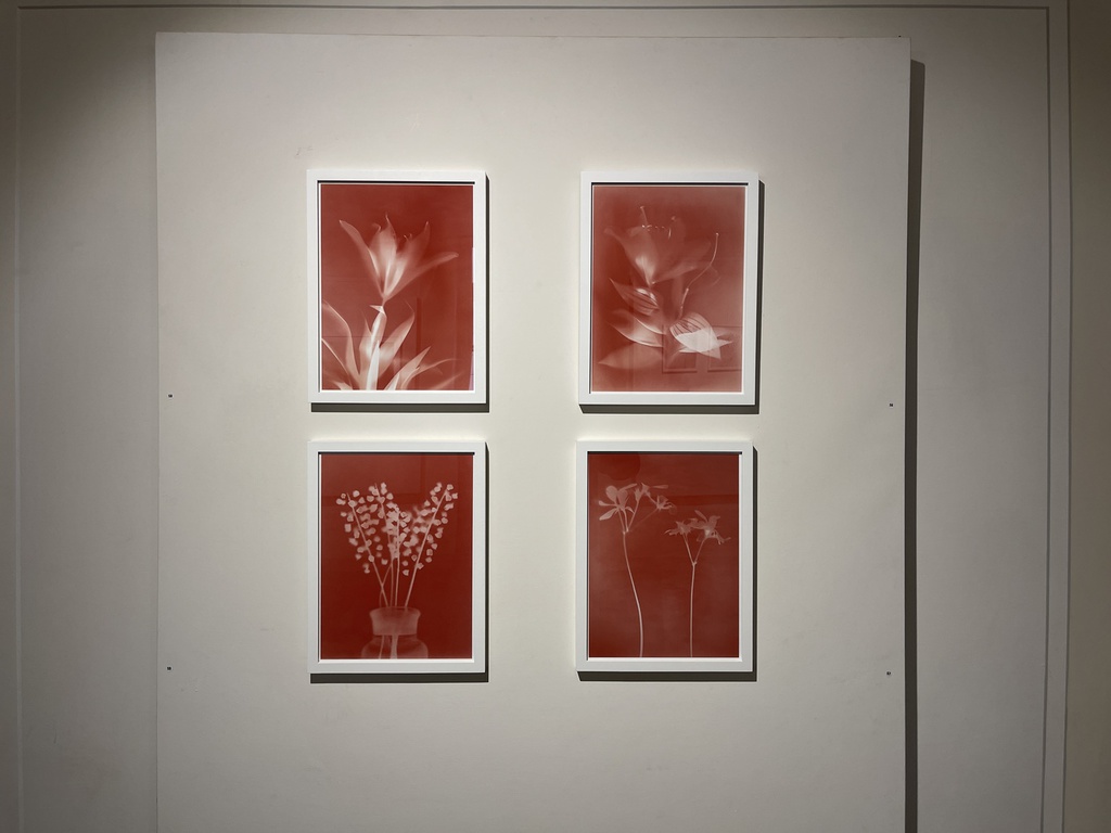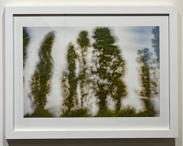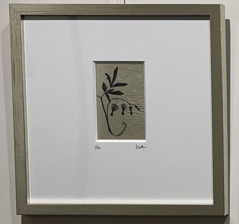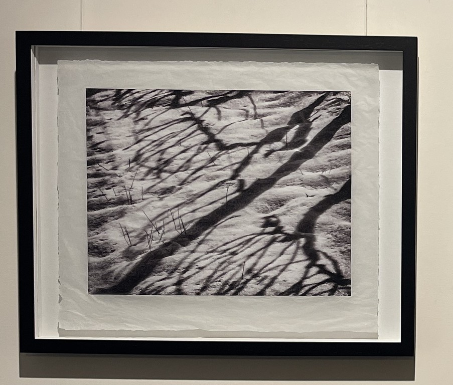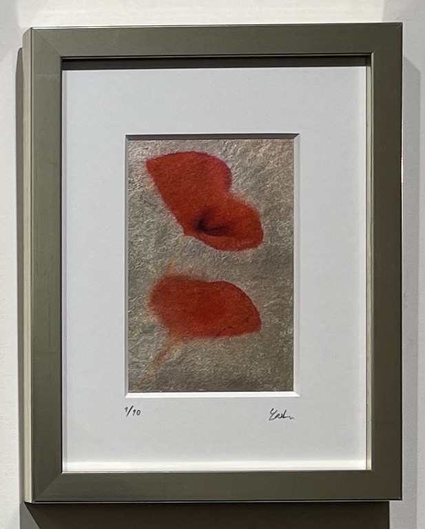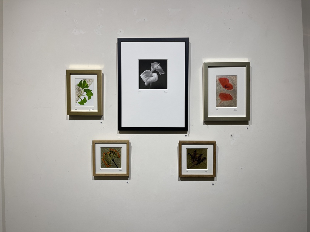 Dabei hat er sich für Abaca-Papier entschieden, das dünn, aber zugleich reißfest ist und in Handarbeit angefertigt wurde. Die Farbigkeit im Naturspektrum Grün, Braun, Grau wird äußerst dezent und bewusst eingesetzt, etwas ganz Besonders ist es, wenn bei einer Blüte mal Rot oder helles Weiß auftaucht, wenn Ginko-Blätter frisch grün glänzen. Das Tableau der Rebstöcke wirkt grafisch, wie eine Konstruktion, erstellt mit Bleistift. Immer wieder muss man sich ins Gedächtnis rufen, es hier mit Fotografien zu tun zu haben.