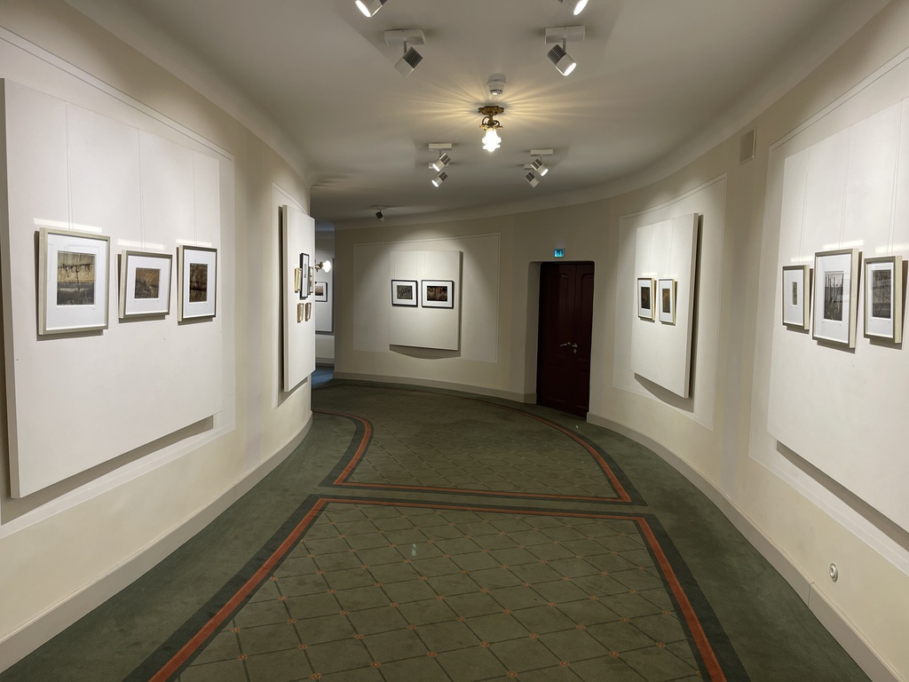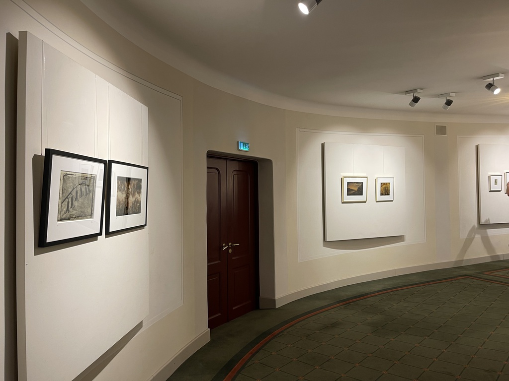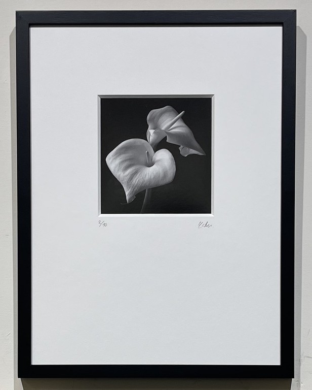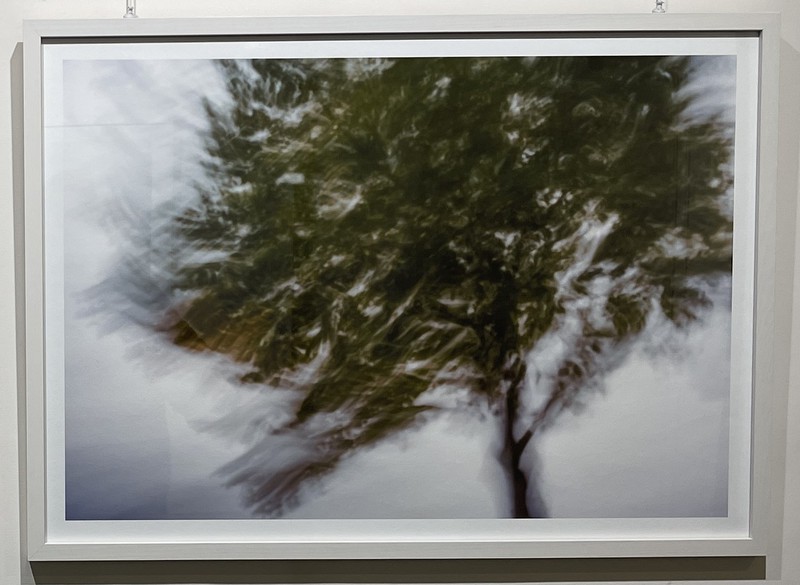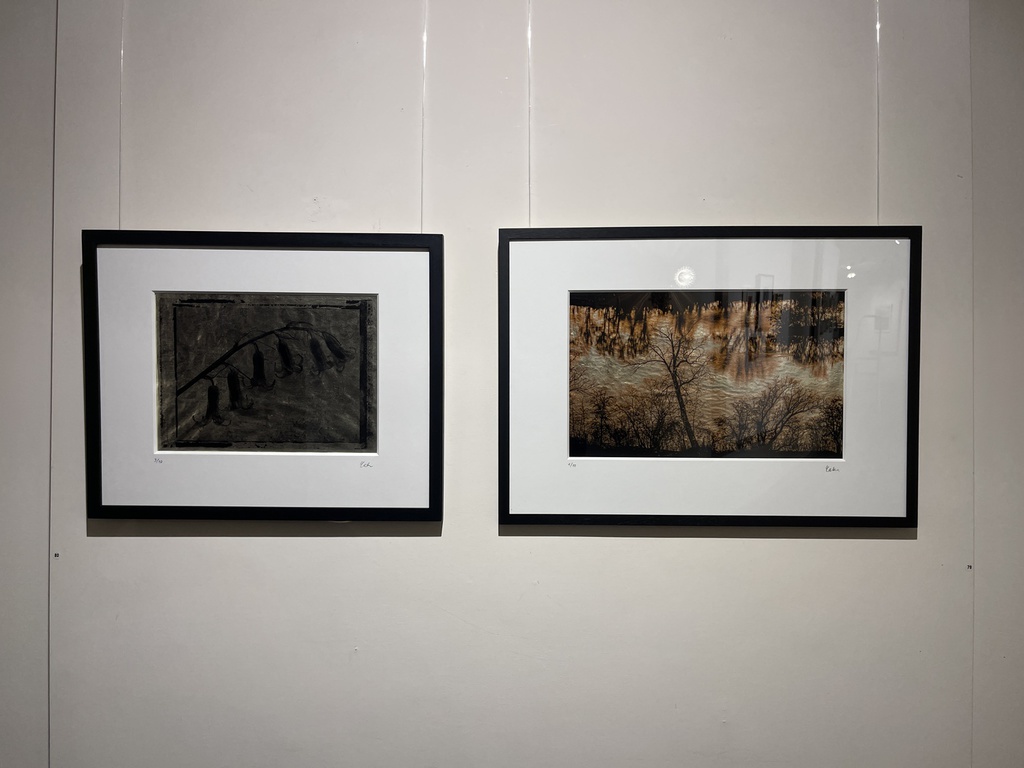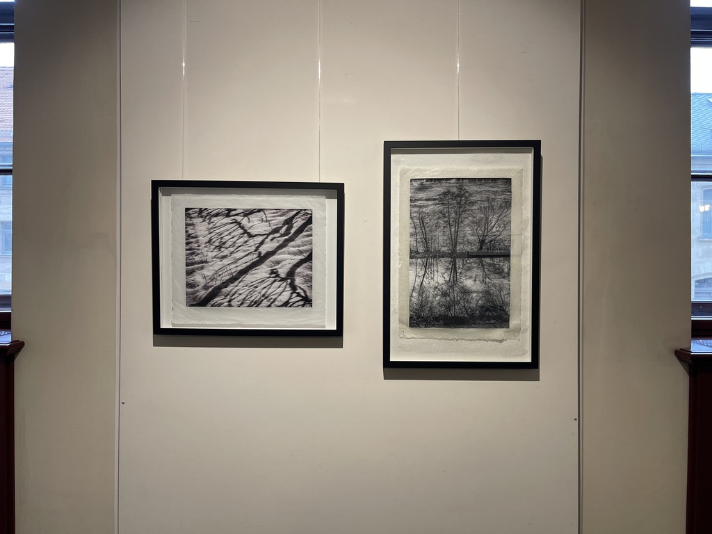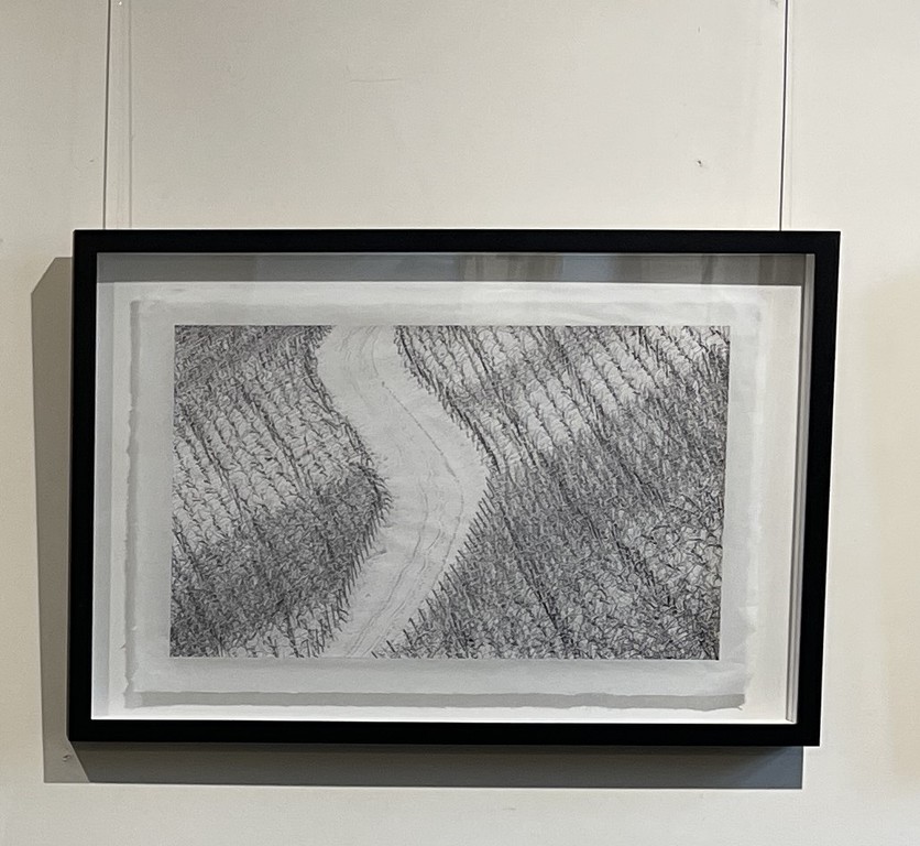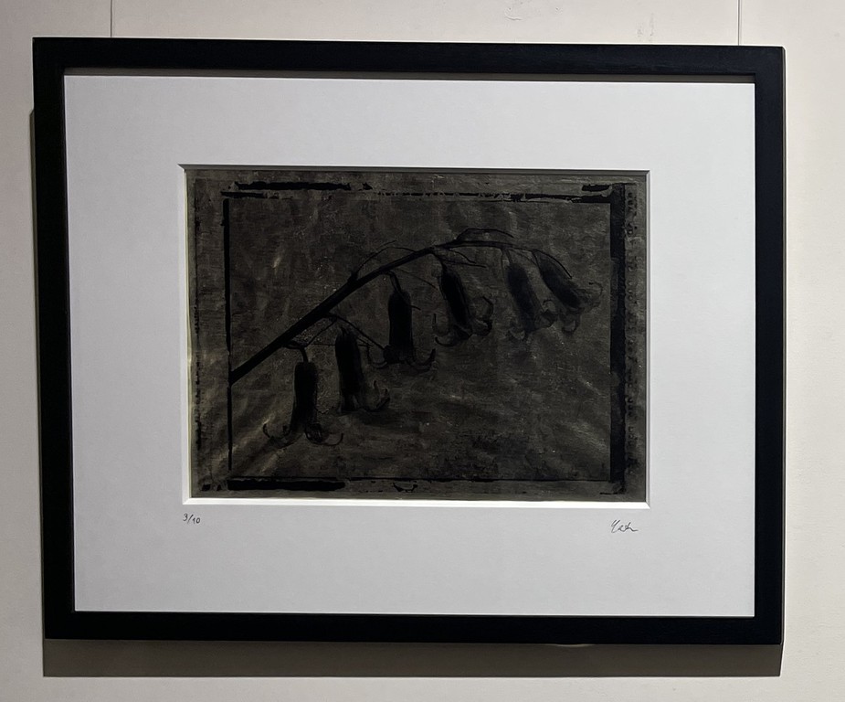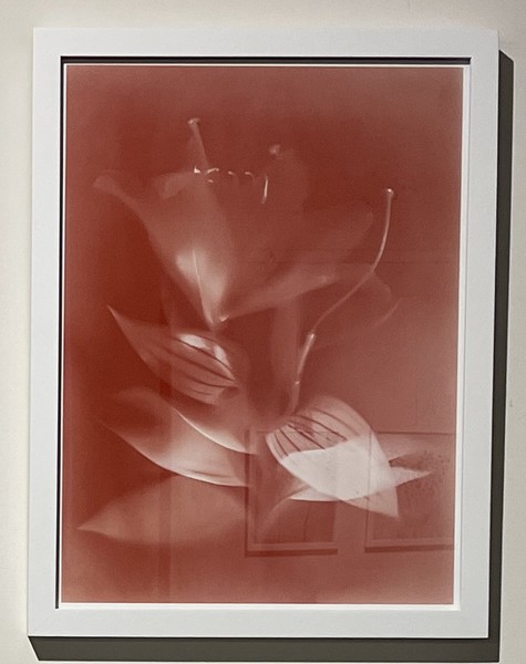 Dabei hat er sich für Abaca-Papier entschieden, das dünn, aber zugleich reißfest ist und in Handarbeit angefertigt wurde. Die Farbigkeit im Naturspektrum Grün, Braun, Grau wird äußerst dezent und bewusst eingesetzt, etwas ganz Besonders ist es, wenn bei einer Blüte mal Rot oder helles Weiß auftaucht, wenn Ginko-Blätter frisch grün glänzen. Das Tableau der Rebstöcke wirkt grafisch, wie eine Konstruktion, erstellt mit Bleistift. Immer wieder muss man sich ins Gedächtnis rufen, es hier mit Fotografien zu tun zu haben.