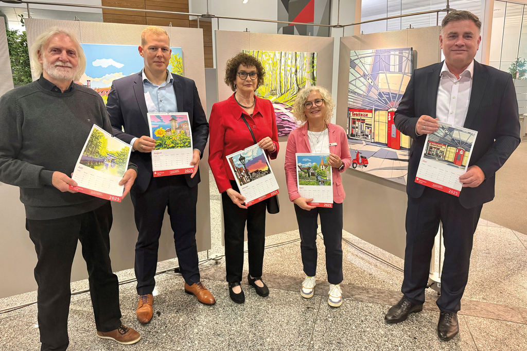 Der Bildkalernder für 2025 wurde kürzlich präsentiert von John Hammond (Art-Agency, v. li.), Kai Tusak (Sparkassen-Vorstandsmitglied), Künstlerin Ilse Feiner, Grafikerin Susanne Weimann-Kothe und Sparkassenchef Adolf Dodenhöft. Foto: Sparkasse Fürth