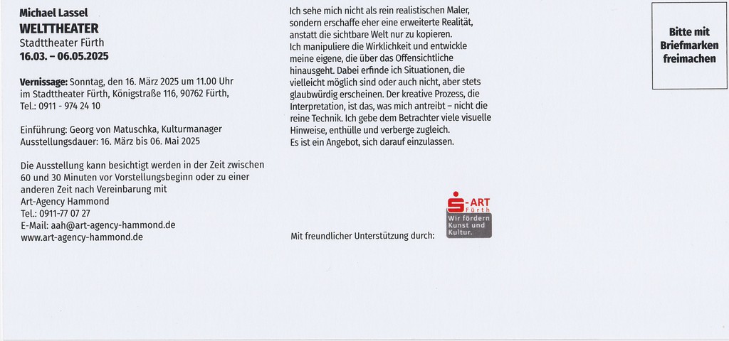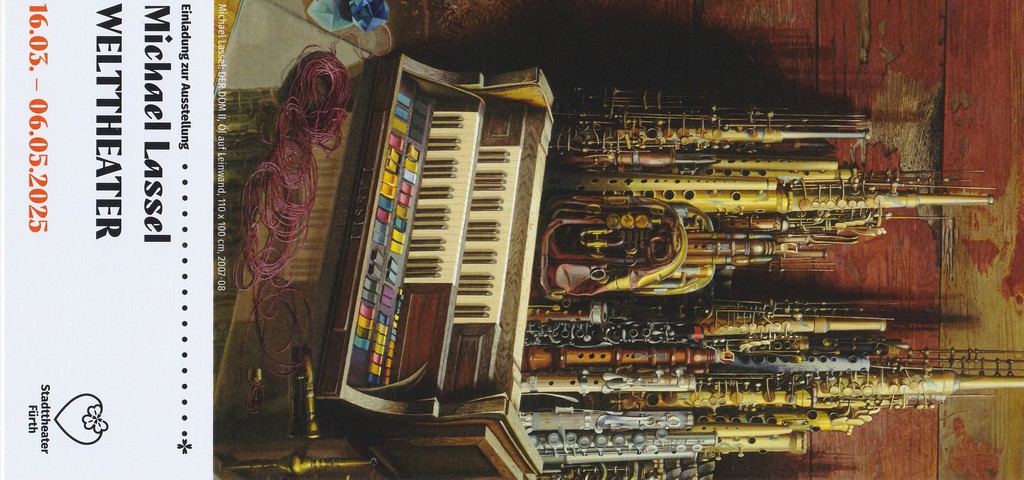 Als der Künstler nach einem ansprechenden Titel für die hiesige Ausstellung suchte, fand er ihn in der begrifflichen Brücke zwischen dem Ausstellungsort „Stadttheater“ und seinen szenisch aufgebauten Bildwerken, nämlich dem Begriff des „Welttheaters“. Dieses Duo ist passend, denn Lassels Gemälde führen zeitlich und räumlich in andere Welten, Zeiten, Epochen.