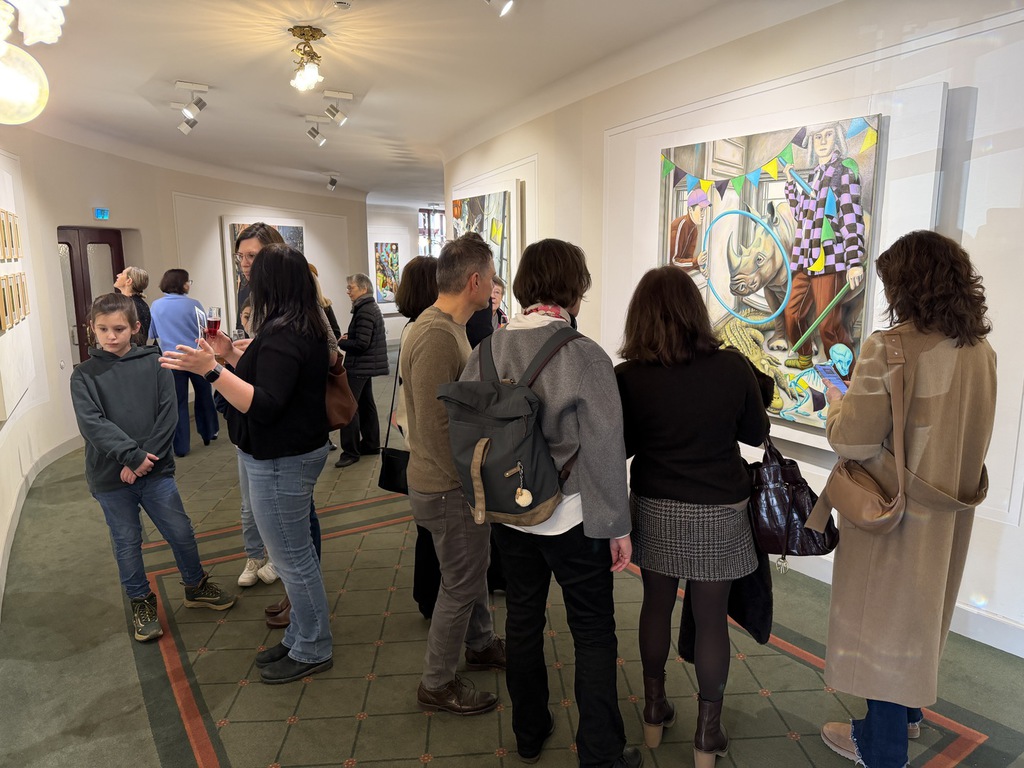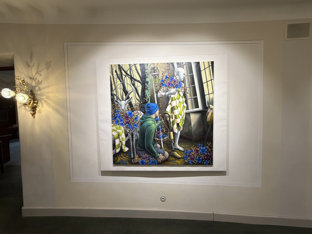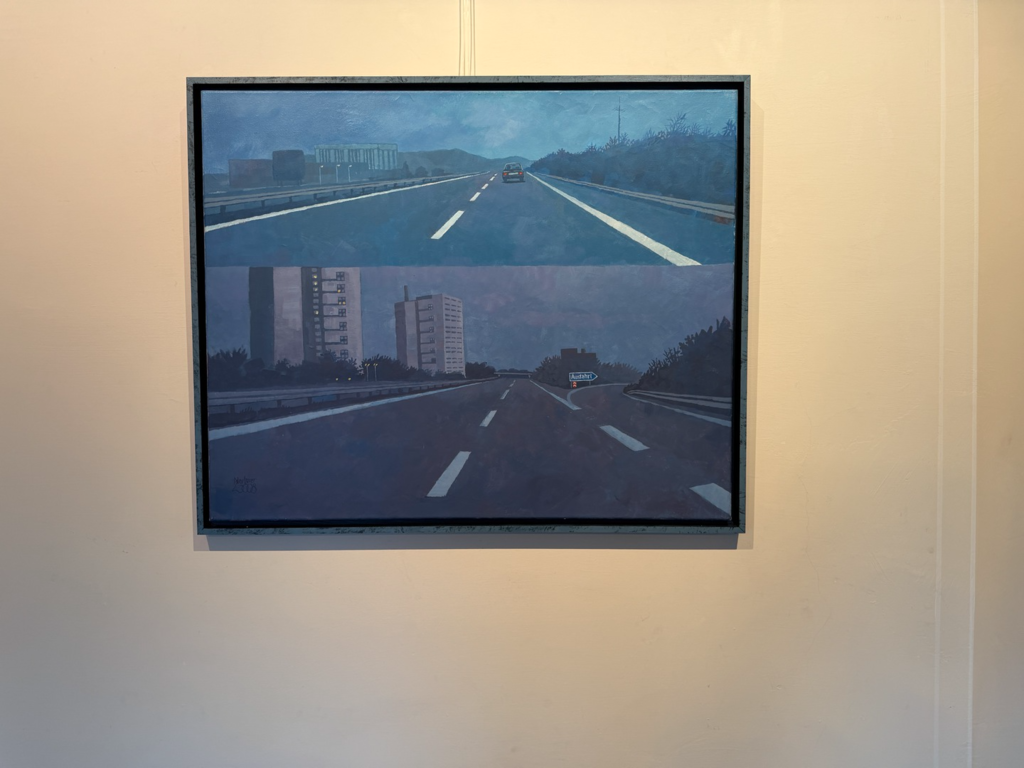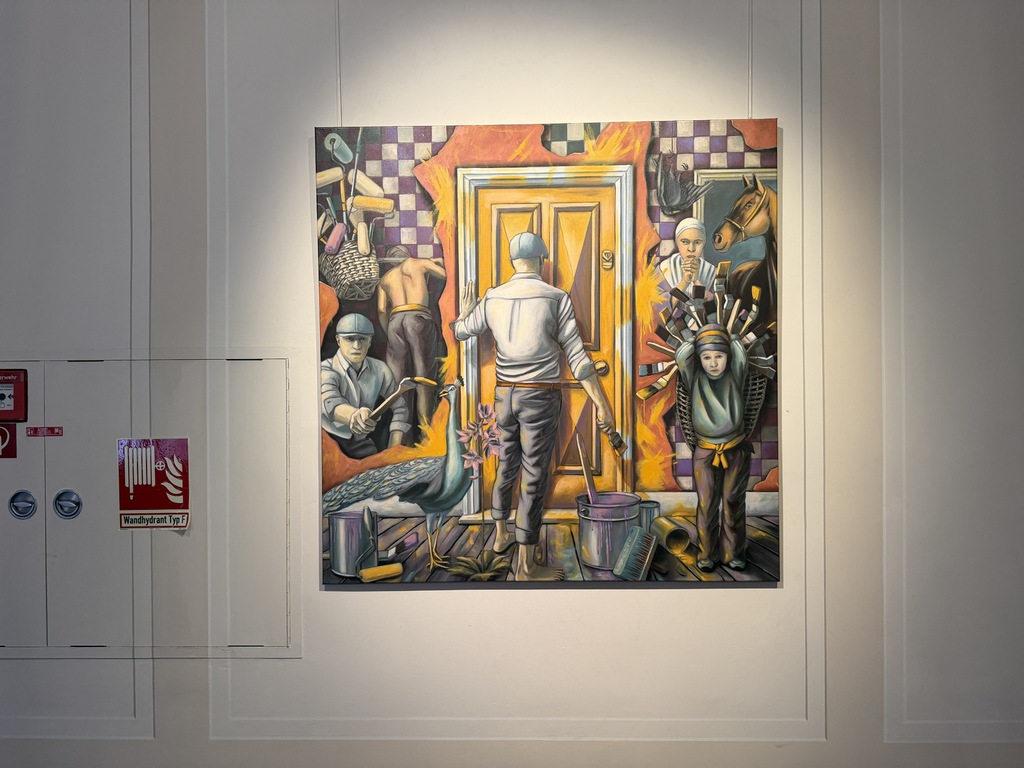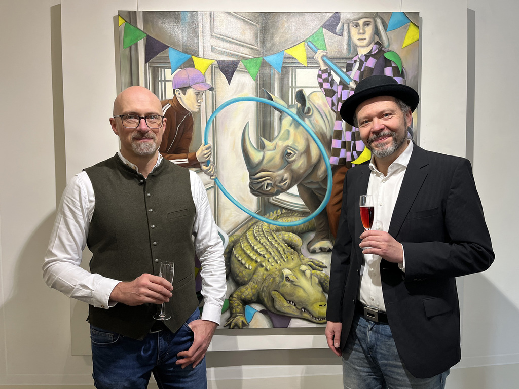 Wer dann an den Arbeiten erst mal vorbeiflaniert, nimmt wahr, dass erstens beide Künstler figürlich malen – also nicht abstrakte Farbflächen oder ein Gewirr von Linien zeigen; dass sie zweitens auf ihrem Malgrund bleiben und der Leinwand nichts applizieren, weder Zweige noch Zahnbürsten, weder Fäden noch Vogelfedern. Drittens, dass es mit dem Flanieren nicht getan ist! Denn beide Künstler bilden nicht einfach plakativ Eins zu Eins was ab – ihre Szenen sind hintergründig!
