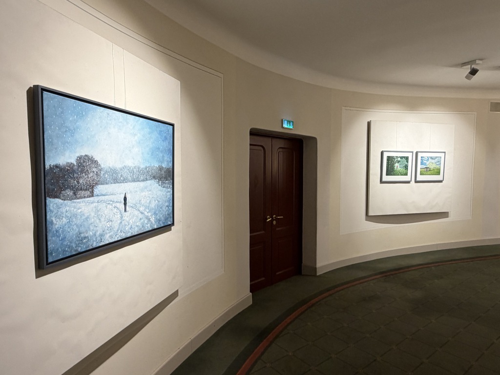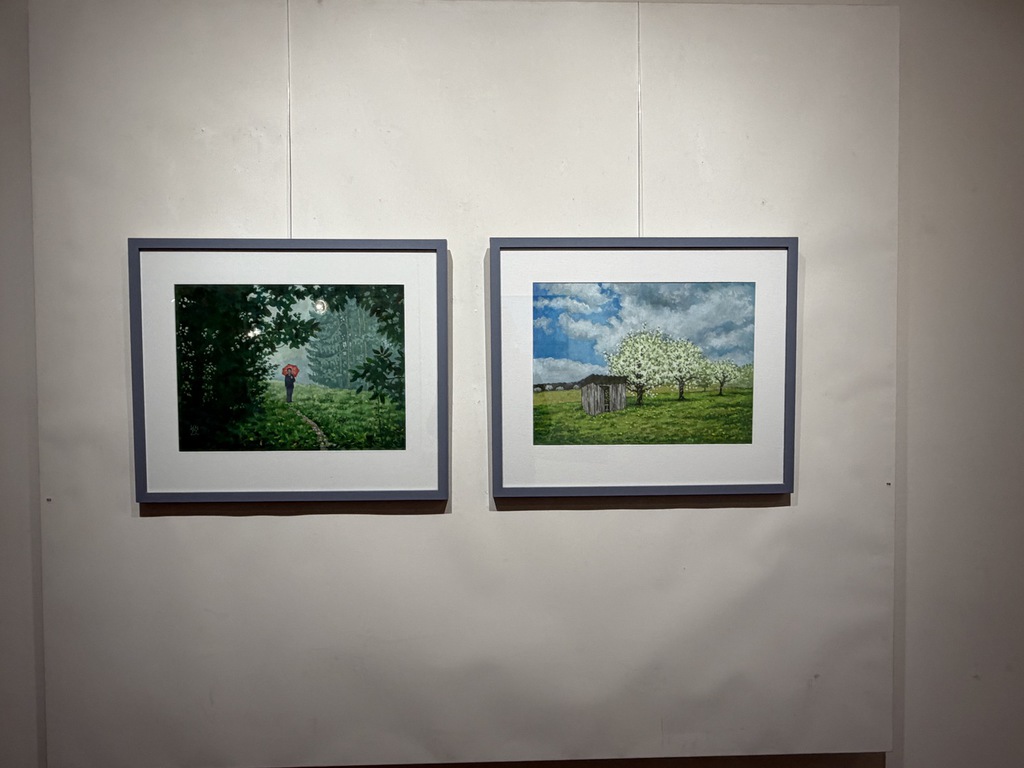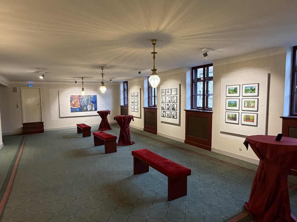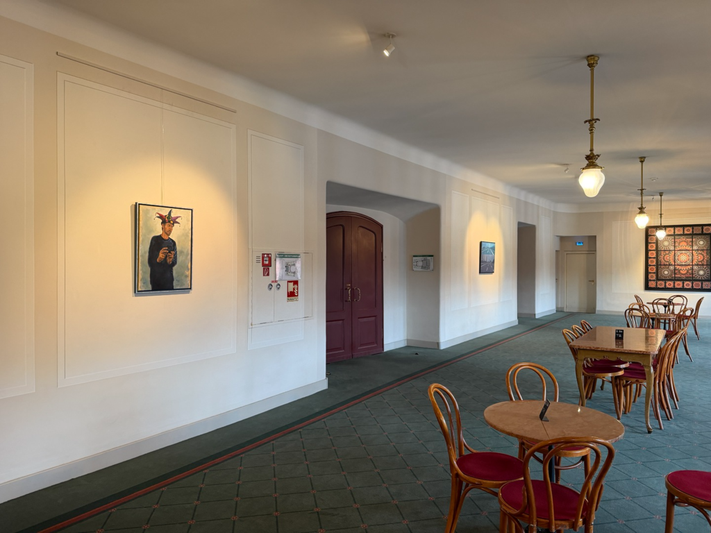 Wer ins Foyer kommt, bemerkt natürlich, dass es am Eingang eine Schnittstelle gibt: Nach links geht’s zu den Arbeiten von Andreas Heindl, nach rechts zu den Gemälden und Zeichnungen von Kurt Neubauer. Auf den ersten Blick fällt auf: Das sind zweierlei Handschriften. Bei Andreas Heindl leuchtende Farben, klare Kanten. Bei Kurt Neubauer dezente Farben und weiche Konturen.