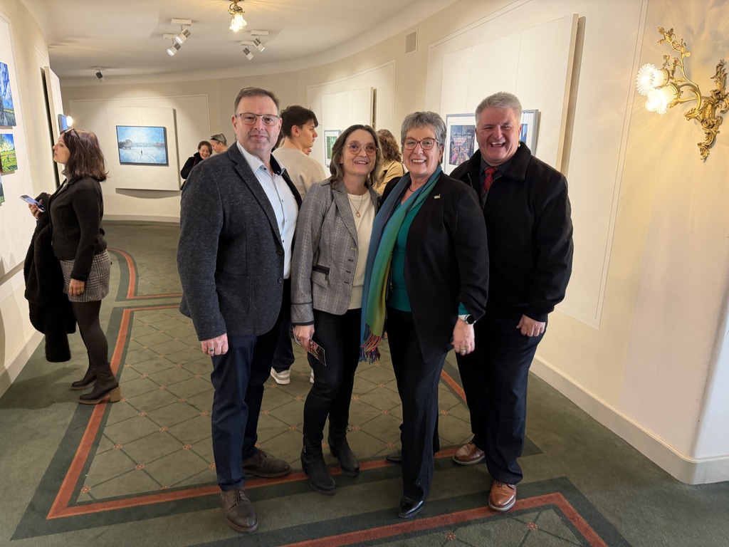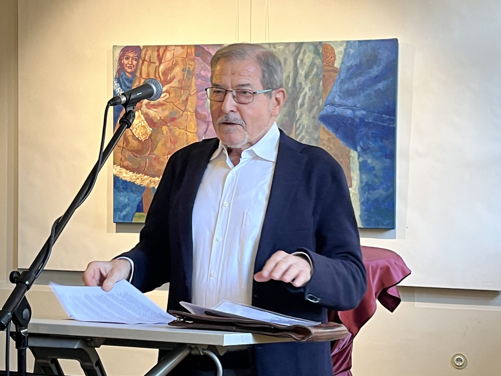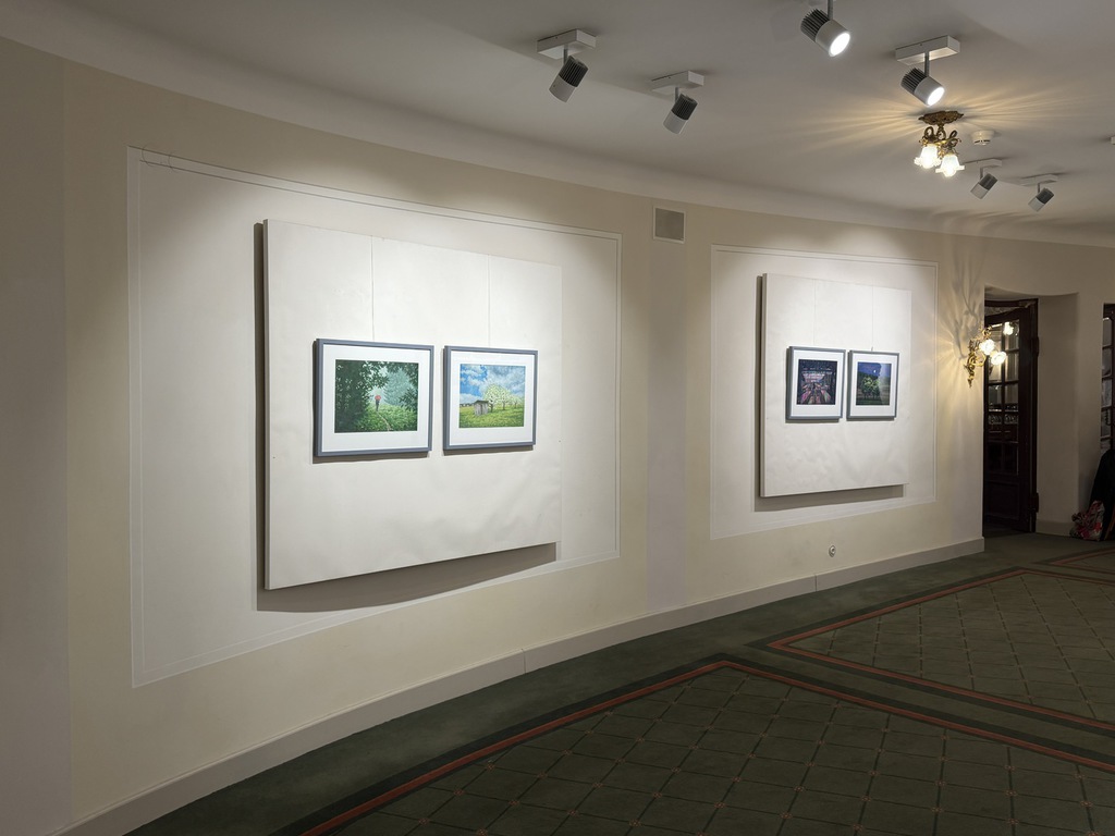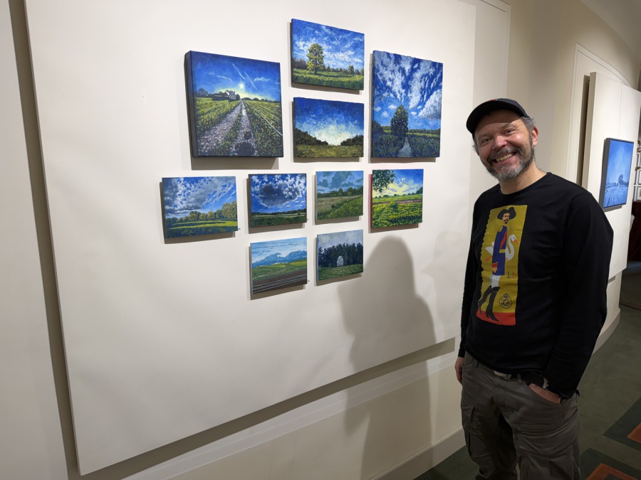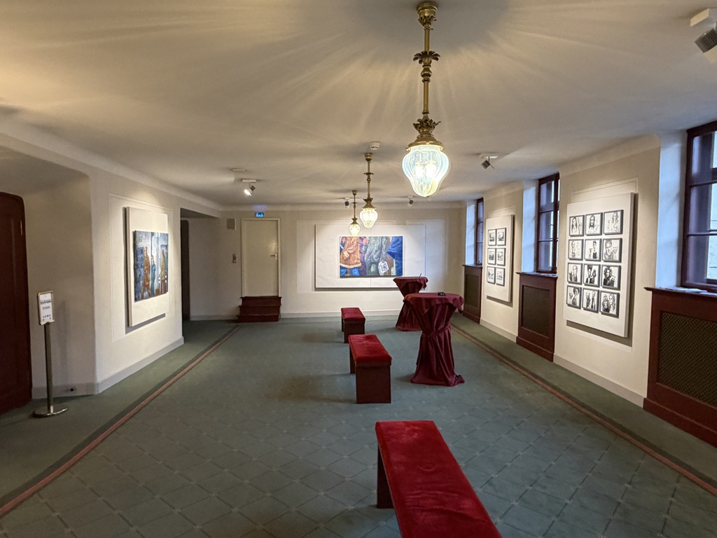 Wer ins Foyer kommt, bemerkt natürlich, dass es am Eingang eine Schnittstelle gibt: Nach links geht’s zu den Arbeiten von Andreas Heindl, nach rechts zu den Gemälden und Zeichnungen von Kurt Neubauer. Auf den ersten Blick fällt auf: Das sind zweierlei Handschriften. Bei Andreas Heindl leuchtende Farben, klare Kanten. Bei Kurt Neubauer dezente Farben und weiche Konturen.