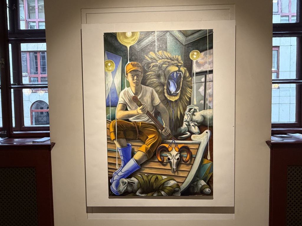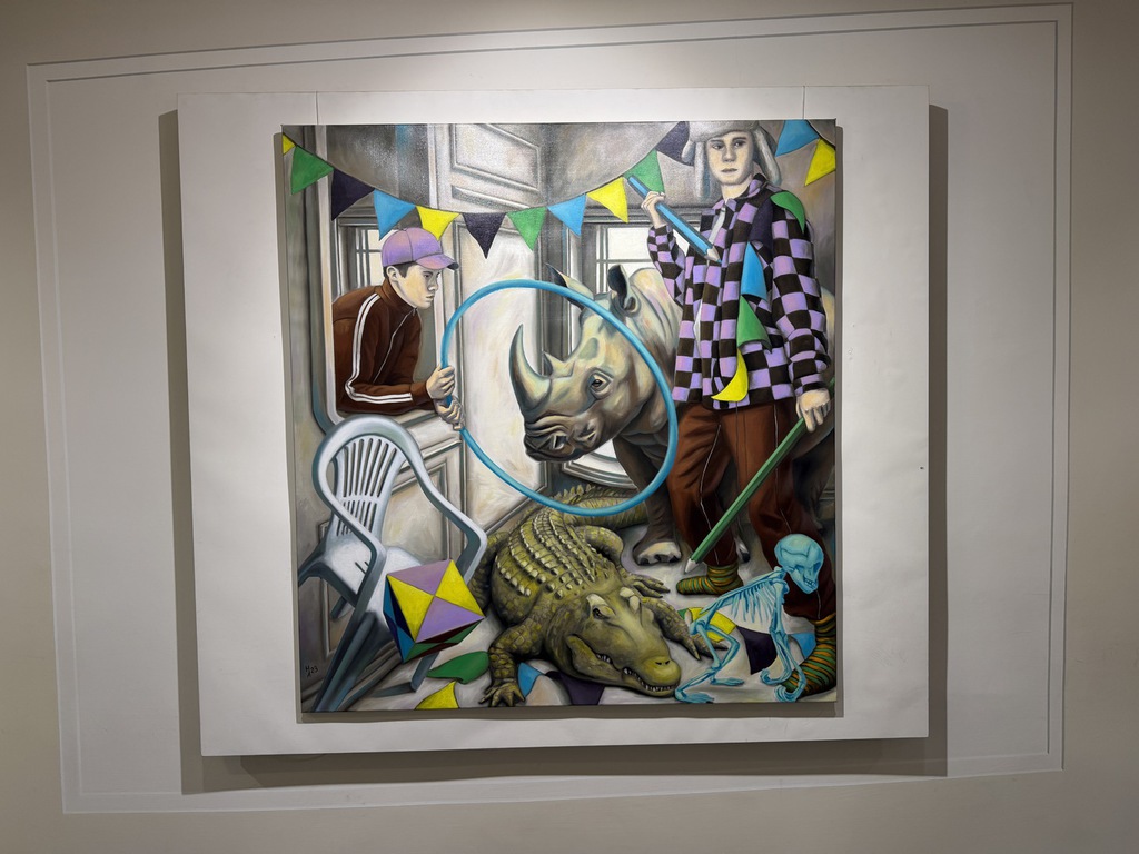 Tiere bevölkern auch die Bilder von Andreas Heindl. Auf dem Gemälde am Ein-gang – abgedruckt auch auf der Einladungskarte – sprengen Tiere schier das enge Zimmer. Nashorn und Krokodil sind Inbild von animalischer Kraft. Aber die hier tun keinem was: Das Krokodil liegt geplättet auf dem Boden; das Nashorn, das durch den Reifen des Dompteurs springen sollte, ist zu schlapp dazu. Nach rechts macht sich das Skelett eines Affen vom Acker. Andreas Heindl malt foto-realistisch genau. Die Szene aber ist surrealistisch. Das Zimmer steht auf dem Kopf, das verrät das Fenster im Hintergrund. Im Wohnzimmer spielt sich was ab, was in den Zirkus gehört. Wieso steht der Stuhl schief? Wieso steckt der junge Mann nur den Kopf ins Zimmer und tritt nicht ein?