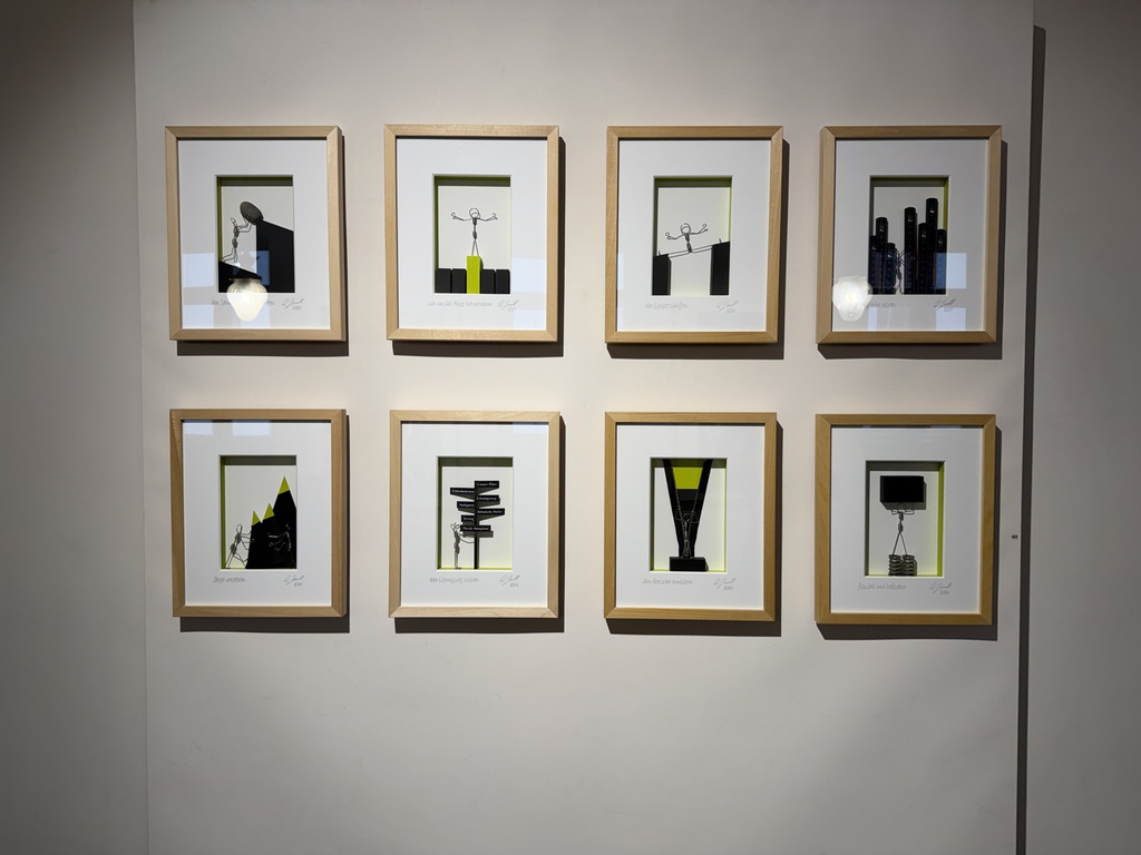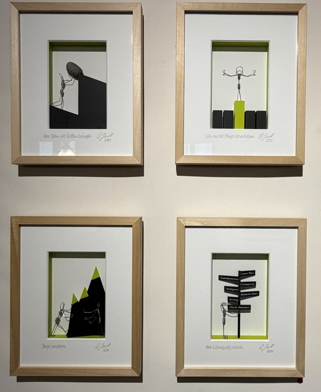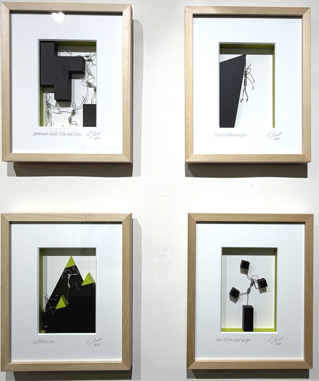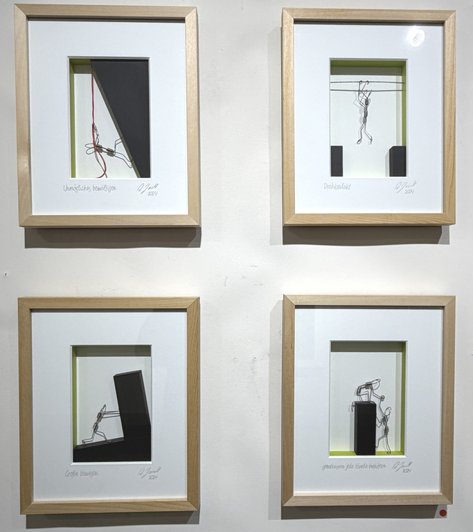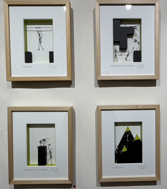 Heindl, der aus Thalmässing stammt und 2020 für den NN-Kunstpreis nominiert war, meidet grelle Farben, alles erscheint in mildem Pastell, die Konturen der Körper und Gegenstände fügen sich sanft in ihre Umgebung. Neben der Malerei betätigt er sich als Skulpteur. In zwei Bildserien, gerahmt und hinter Glas, präsentiert er ein Männchen aus gebogenen Drähten, das sich in einer Welt aus weißer Leere und schwarzen Blöcken bewegt. Es klettert am Seil, hangelt sich über Abgründe, hievt sich an Überhängen hoch, macht Spagat über einer Kluft. Der Betrachter assoziiert den Mythos von Sisyphus, der in alle Ewigkeit seinen Stein wälzt. Hier aber waltet ein spielerischer Umgang mit der massigen Materie. Wir dürfen uns Sisyhus als einen glücklichen Menschen vorstellen.