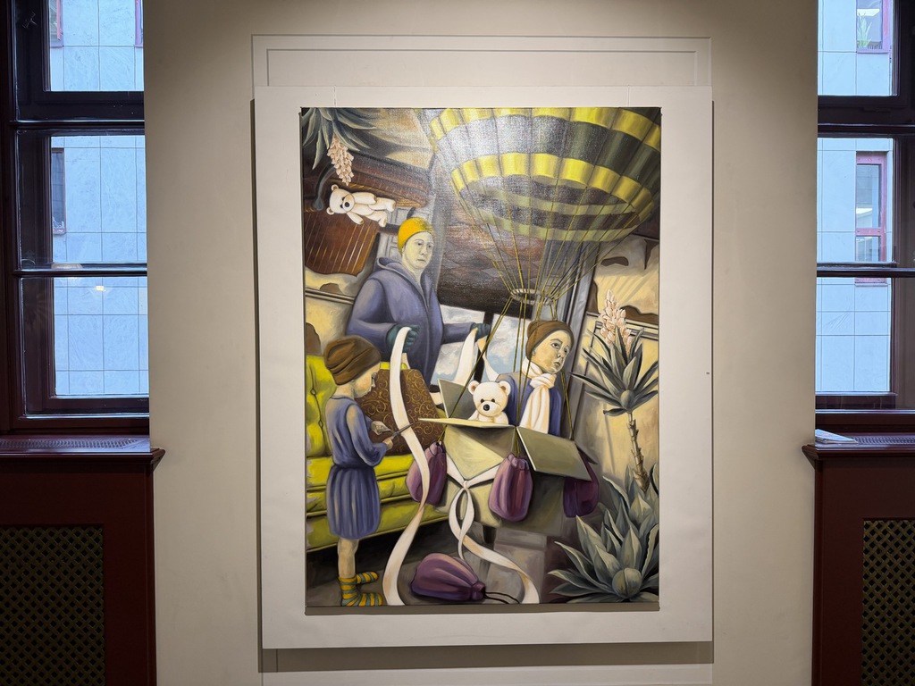Die Bewohner träumen vom Ausbruch. Ein Bub hat sich einen Fesselballon gebaut. Der Korb besteht aus einem Karton. Alles bereit zum Abflug. Bloß, wohin soll der Ballon entschweben? Ein anderes Bild nimmt direkt Bezug auf die Künste. Vor einem Konzertflügel steht eine Dame in Schleiern und wiegt eine weiße, nackte Statue in den Armen. Vier weitere Statuen leisten ihr Gesellschaft. Stehen sie symbolisch für die Musik? Im Innenohr verwehen hauchzarte Akkorde eines Nocturnes von Chopin.