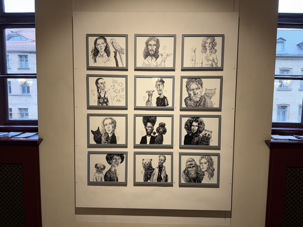 Doch Kurt Neubauer – in Nürnberg betreibt der Forchheimer ein erfolgreiches Grafikatelier – beweist auch Humor. In einer Serie von zwölf Tuschzeichnungen präsentiert er Mensch und Tier als „Kameraden“. Einem langhaarigen Jesustyp leistet ein Lamm Gesellschaft, ein Hermelin reckt sich neben einer Dame mit Hasenzähnchen, ein Pudel wetteifert mit dem Afrolook seines Frauchens, eine Frau hängt mit einem Gorilla ab, ein Mädchen im Badeanzug sieht sich von Fischen verfolgt, eine Dame hält Zwiesprache mit einem Papagei. Bloß wer plappert hier wem nach?