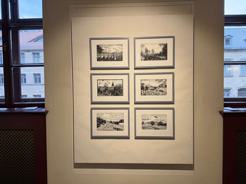 Kurt Neubauer verrät in seinen Bildern so Einiges über sich: Den Motiven sehen wir an, dass er ein Wanderer in der Fränkischen ist und ein Flaneur in der Stadt. Wer die Buchstabenfolge Q-R-T laut liest, spricht unwillkürlich seinen Vor-namen aus: Kurt; auf dem Buch in der Tasche des Spaziergängers stehen seine Initialen: K und N. Und welche Tiere er zu Hause hat, das erfahren wir aus den Tuschzeichnungen hier.