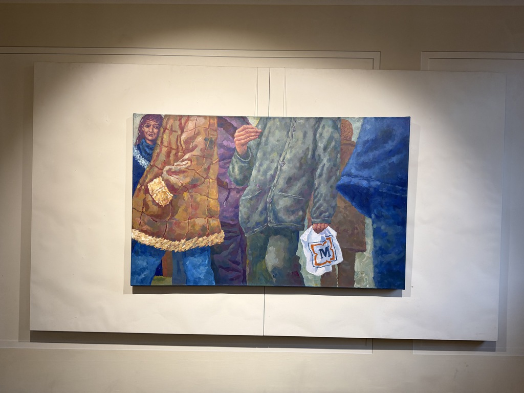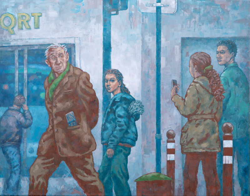 Das Bild mit dem Titel „QRT“ könnte fast gleichzeitig entstanden sein. Hier sehen wir sehen Gesichter, aber die wenden sich einander nicht zu. Auch hier blickt uns nur eine einzige Frau an, scheint kurz innezuhalten. Selbst der Spaziergänger, der die Hände auf dem Rücken verschränkt, hat es eilig. Die Dame rechts mit dem Pferdeschwanz schaut auf ihr Handy oder spricht etwas hinein, der junge Mann im Hintergrund ganz links hält sein Handy ans Ohr. Vielleicht sprechen sie sogar miteinander – aber eben nur übers Telefon, wo sie doch in Sichtweite sind. Vereinsamung. Voneinander abgeschnitten. Noch einmal also: Schnittstellen!