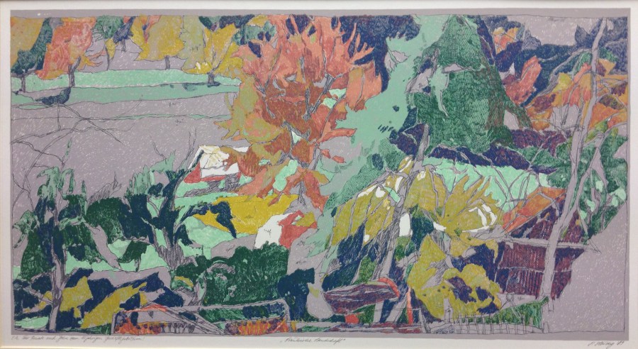 This coloured woodcut from 1990 includes a personal New Year greeting inscription from Peter Häring to John and Renate Hammond.