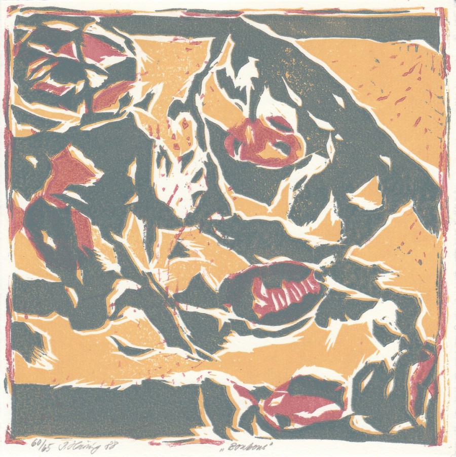 This vibrant coloured woodcut, BONBONS (1988), carries a personal New Year greeting inscription from Peter Häring to John and Renate Hammond.
