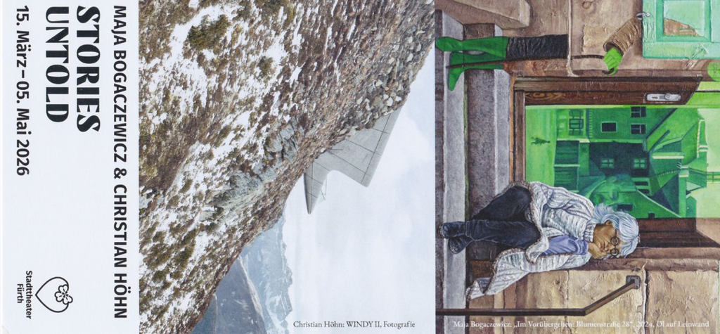 So überrascht Höhn, bekannt vor allem durch atemberaubende Fotografien von Megacities, im Stadttheater zugleich mit ungewöhnlichen, Irritationen hervorrufenden Aufnahmen moderner Architektur im alpinen Bereich. Bogaczewicz wiederum, deren Leitmotiv die poetische Durchdringung von innerer und äußerer Welt ist, widmet sich vielschichtigen Aspekten ihrer Wahlheimatstadt Fürth und den diversen, dort ansässigen Menschen.