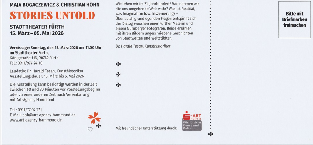 Wie leben wir im 21. Jahrhundert? Wie nehmen wir die uns umgebende Welt wahr? Was ist Realität, was Imagination bzw. Inszenierung? – Über solch grundlegenden Fragen entspinnt sich der Dialog zwischen einer Fürther Malerin und einem Nürnberger Fotografen. Beide erzählen mit ihren Bildern ungeschriebene Geschichten von Stadtwelten und Weltstädten.